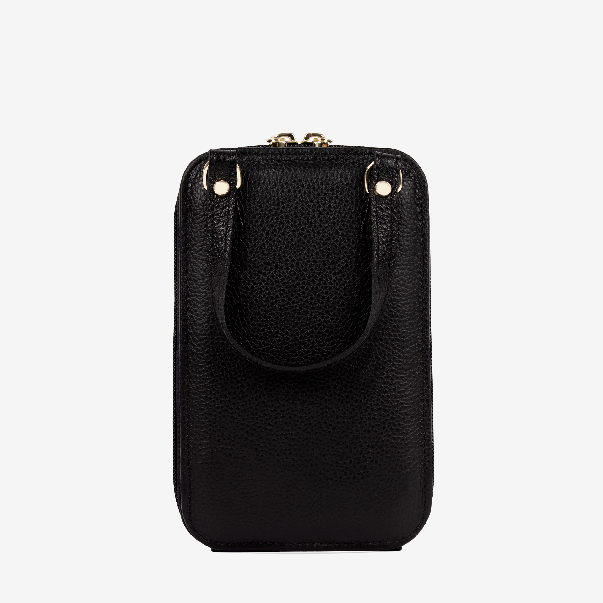 Uma asa de mão e alça de tiracolo removível em pele para usar na mão ou no ombro.