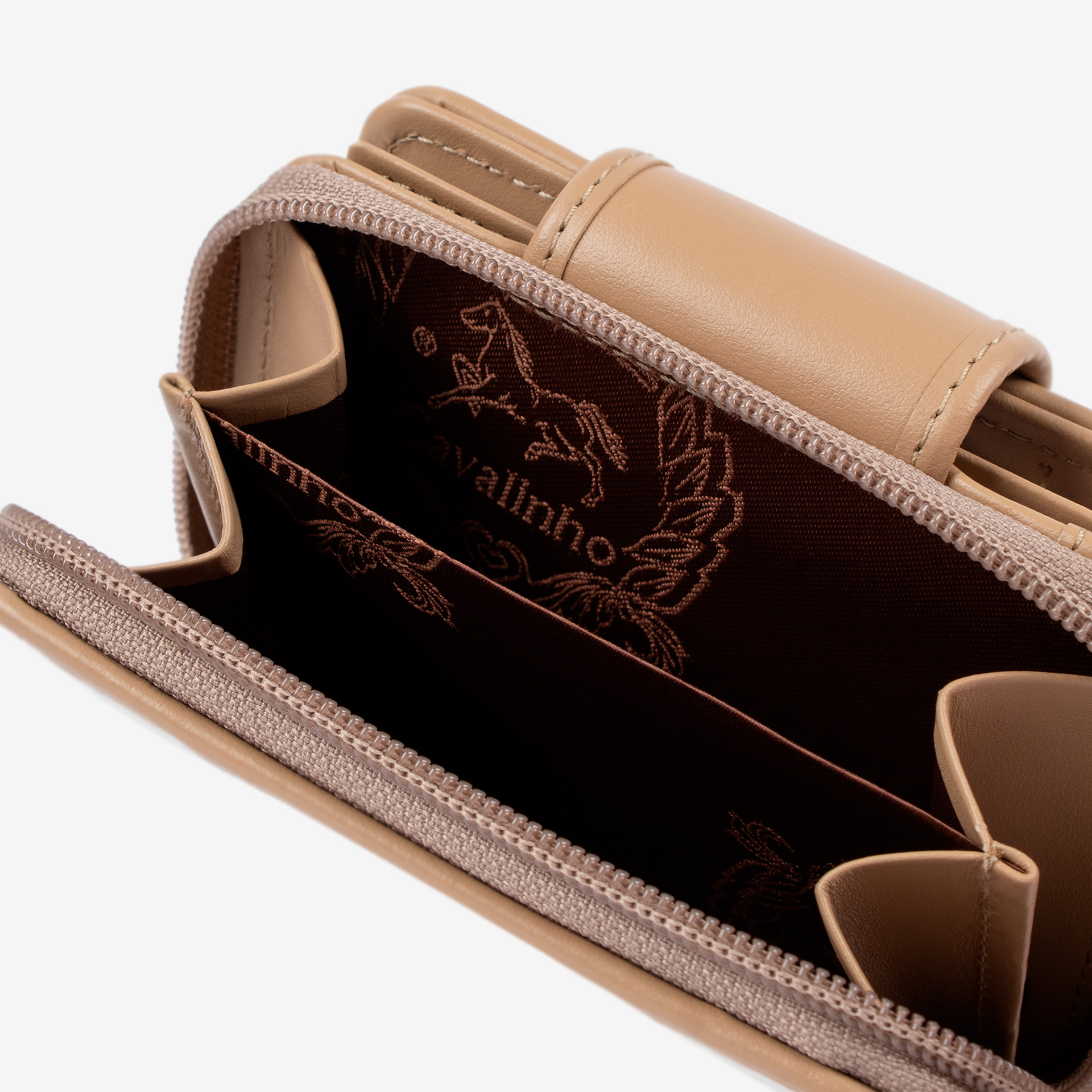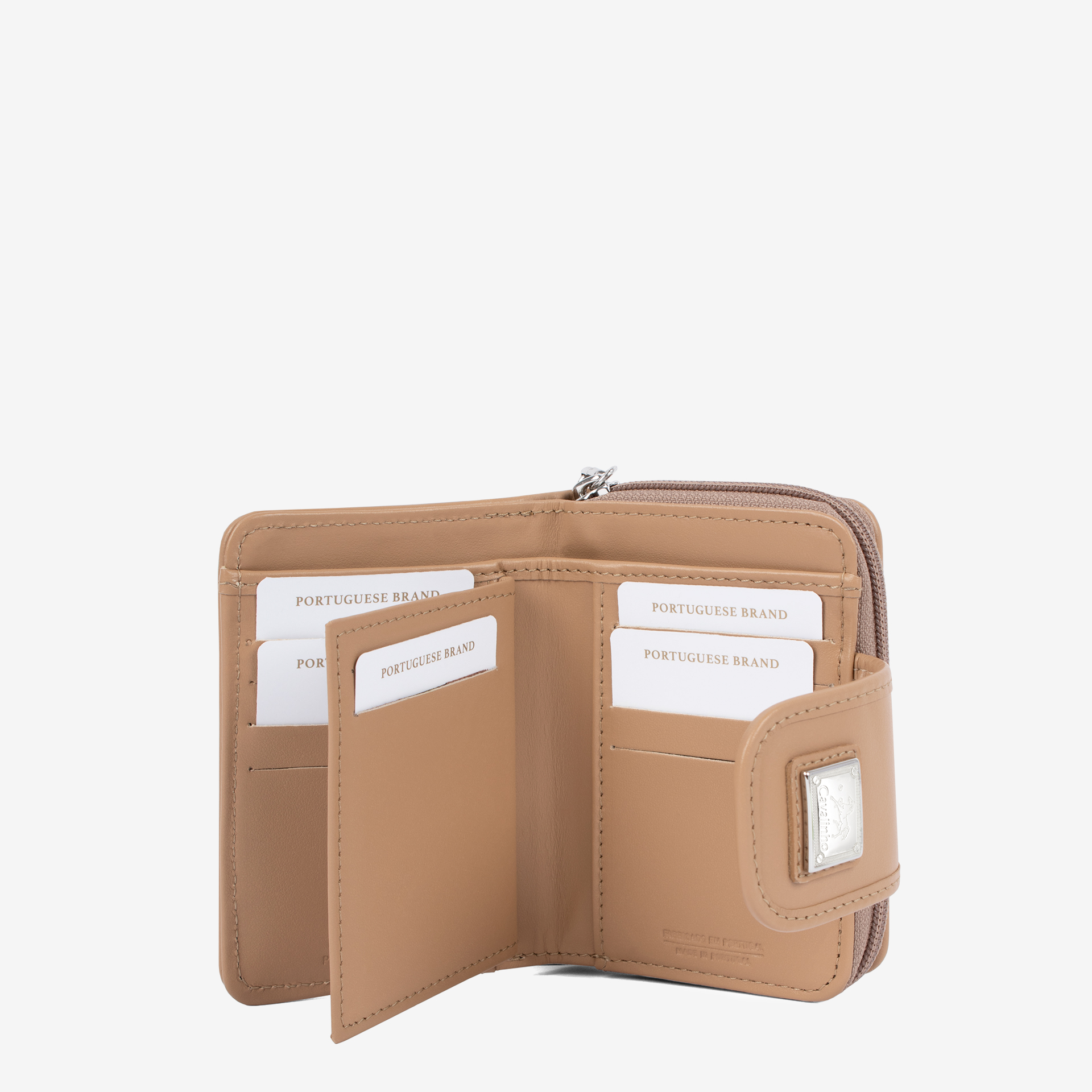 Porta moedas no exterior com fecho de correr.