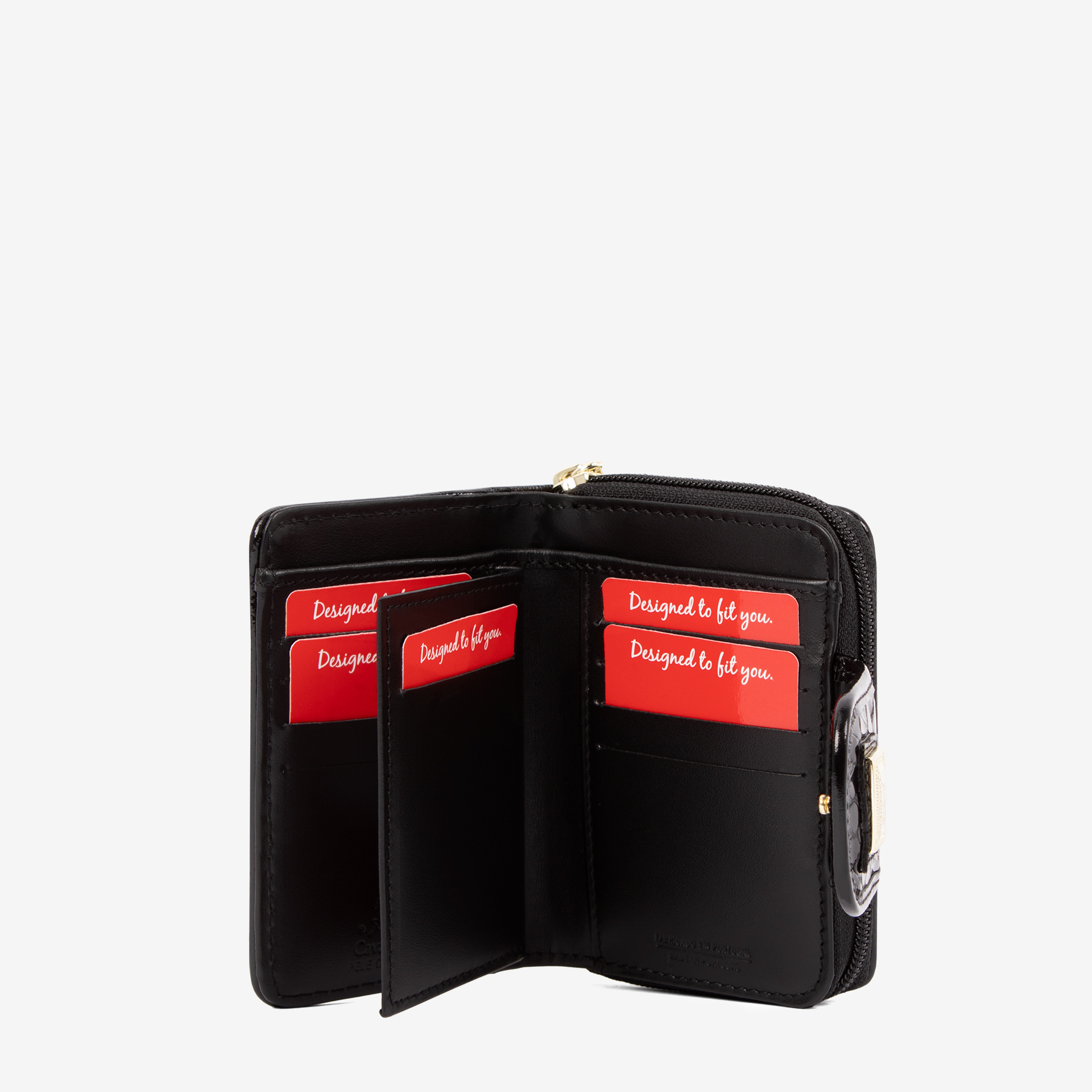 Espaço para 12 cartões, uma mica, duas divisões para documentos e uma divisão para notas.