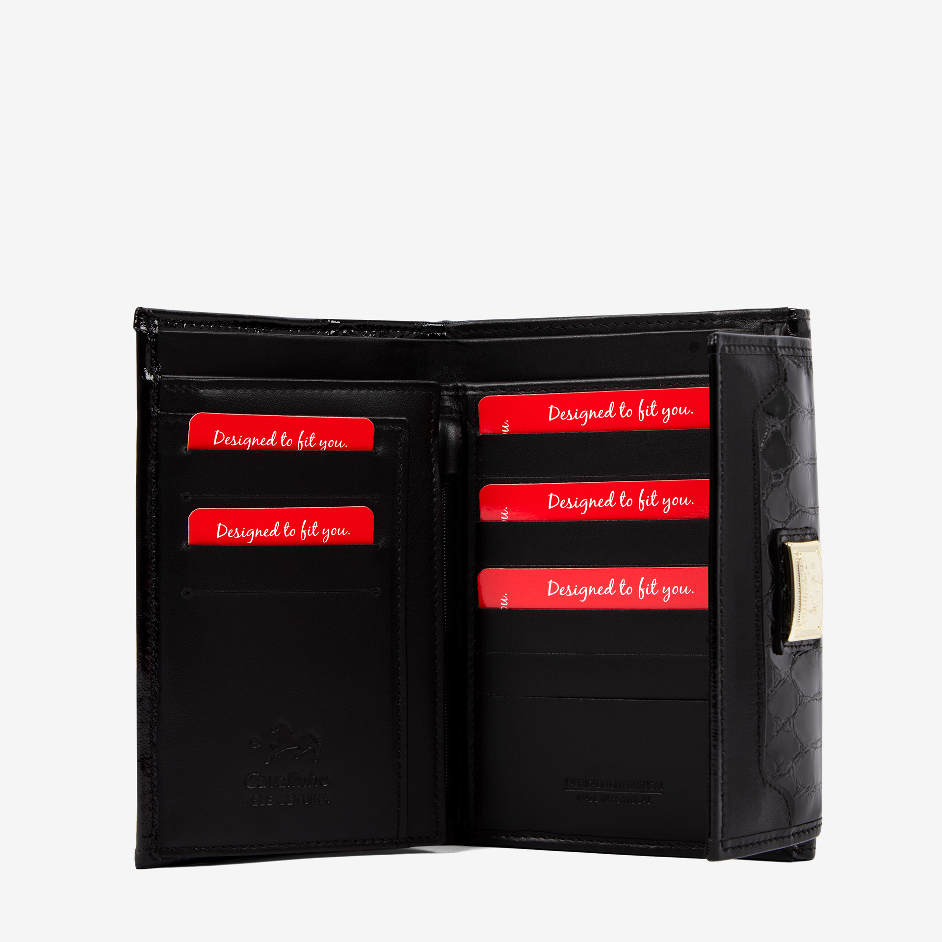 Espaço para 11 cartões, duas micas, três divisões para documentos uma delas com fecho de correr e duas divisões para notas.