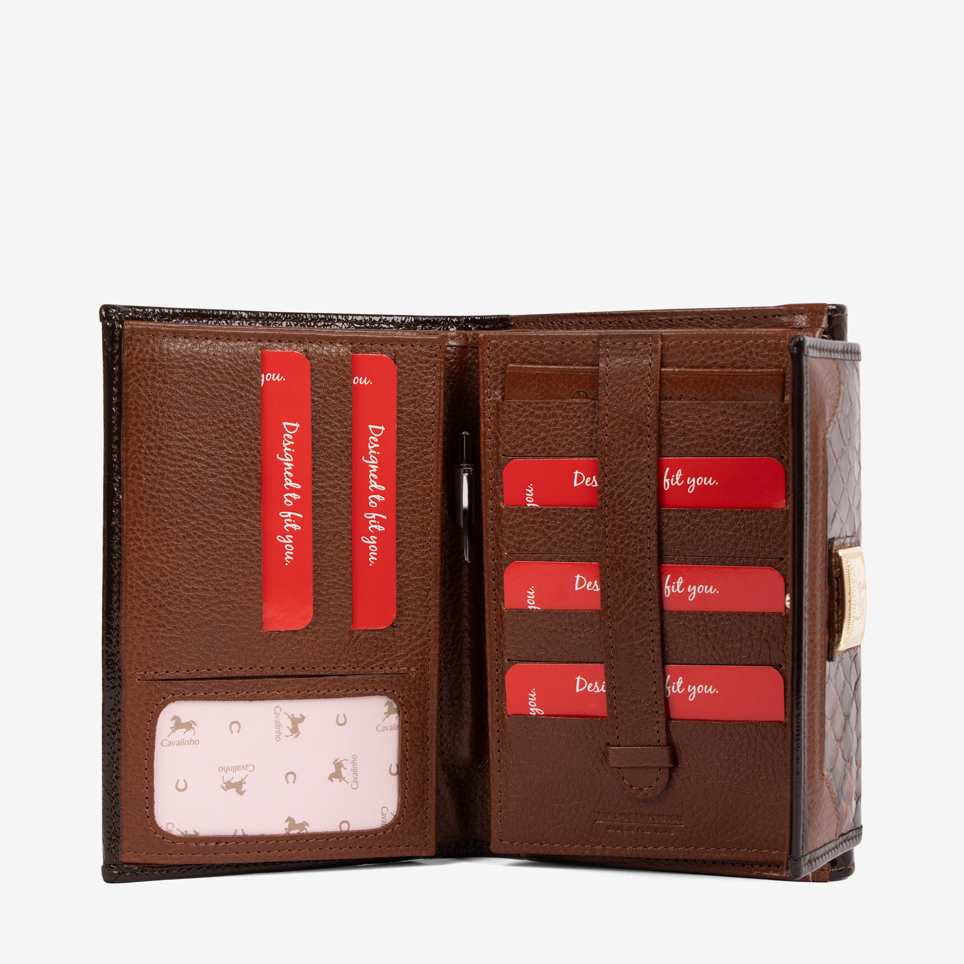 Espaço para 19 cartões, três micas grandes e uma mica pequena, uma divisão para documentos, uma divisão para notas e uma caneta.