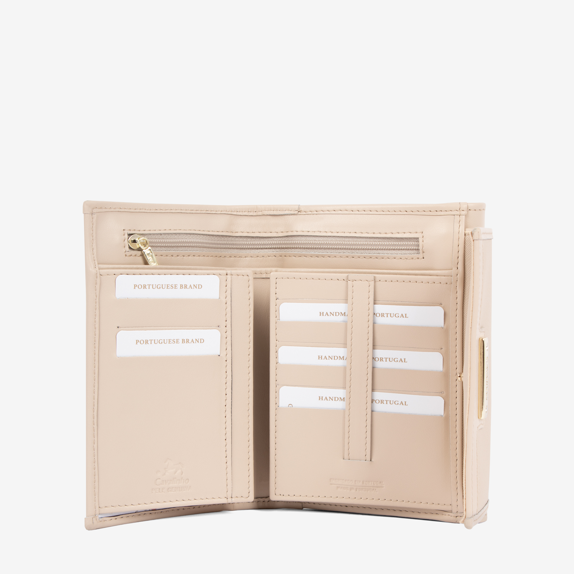 Espaço para 15 cartões, três micas, duas divisões para documentos, uma divisão para notas e uma divisão com fecho na zona das notas.