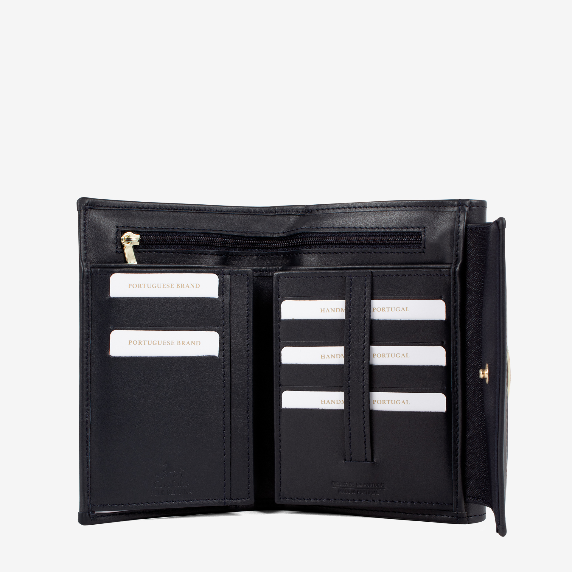 Espaço para 15 cartões, três micas, duas divisões para documentos, uma divisão para notas e uma divisão com fecho na zona das notas.