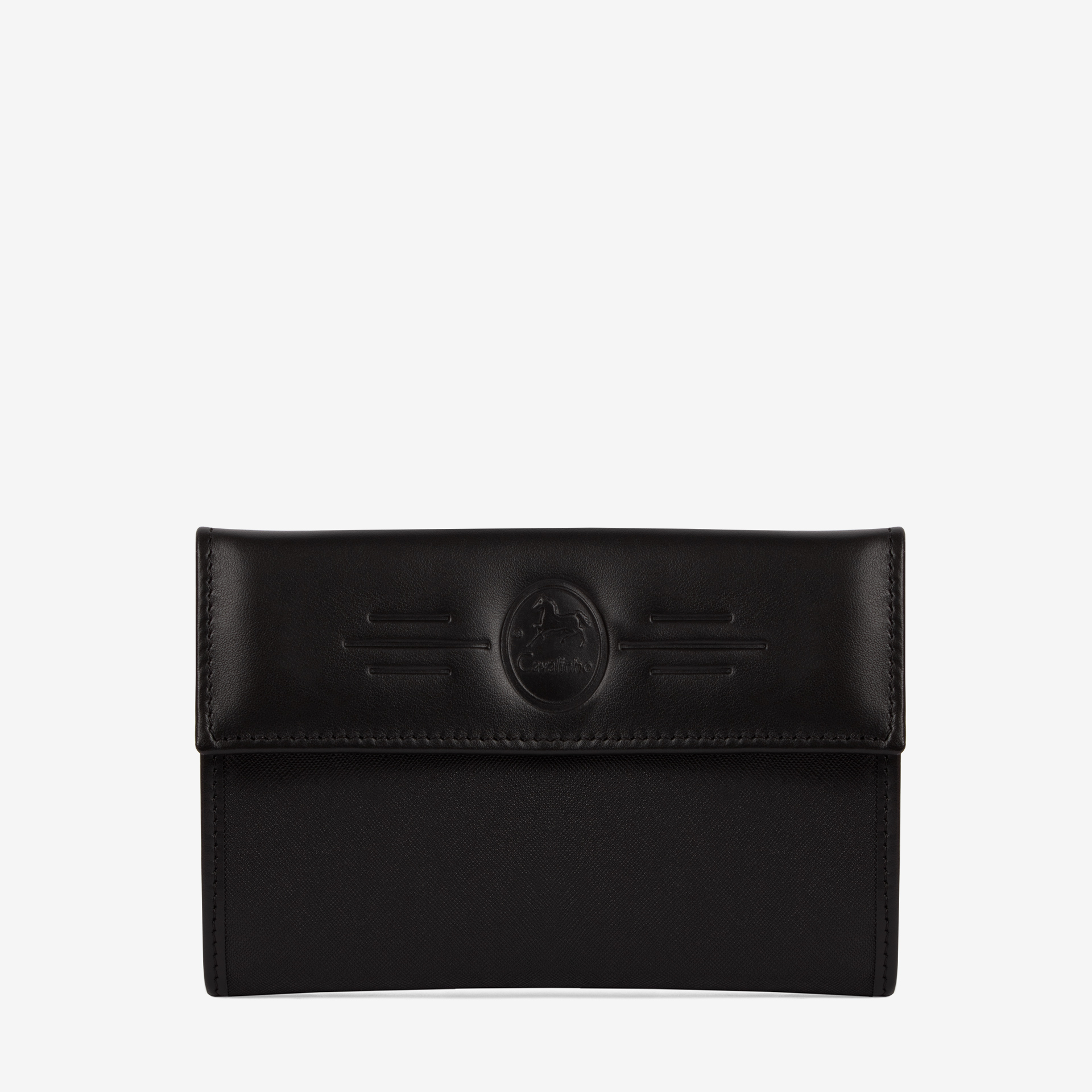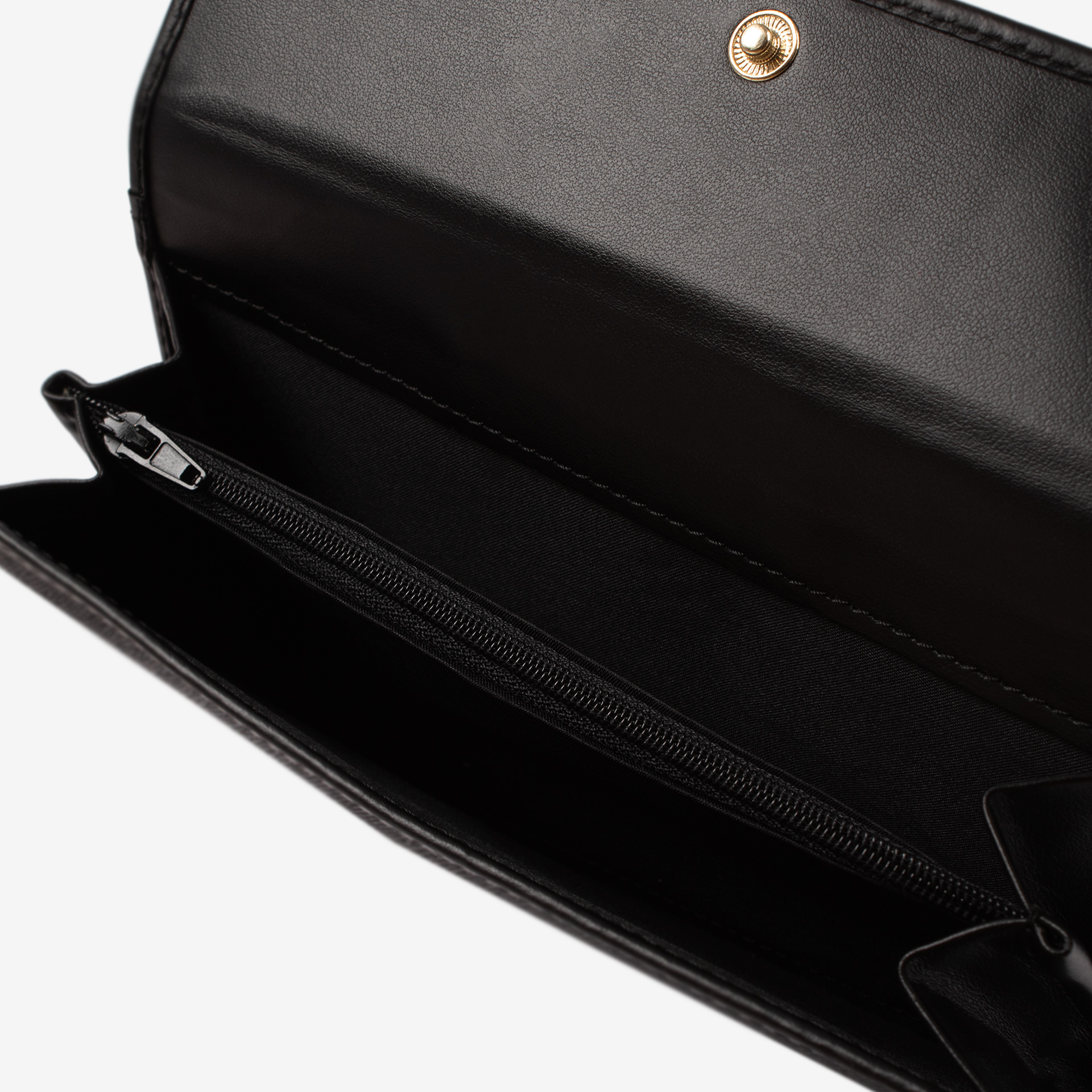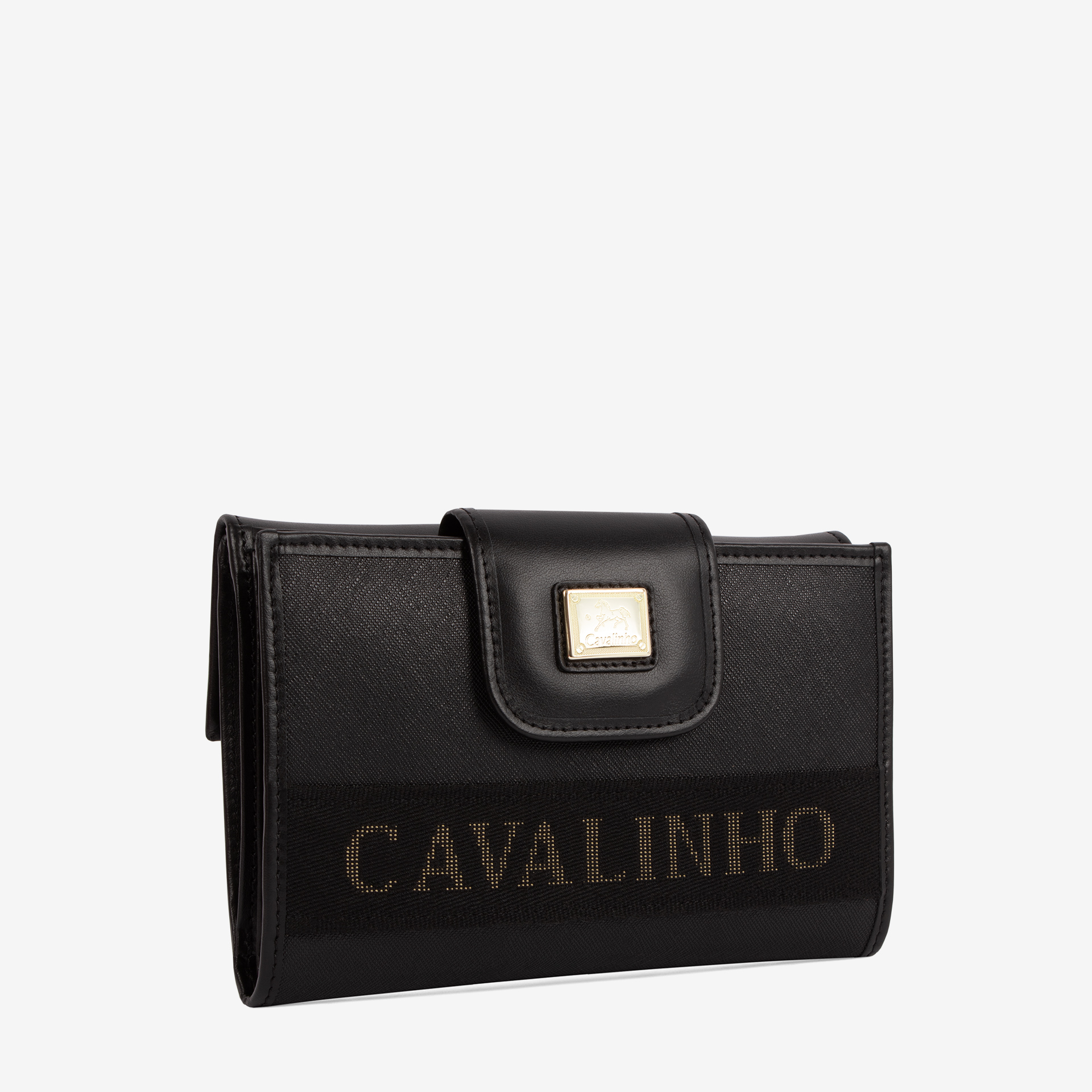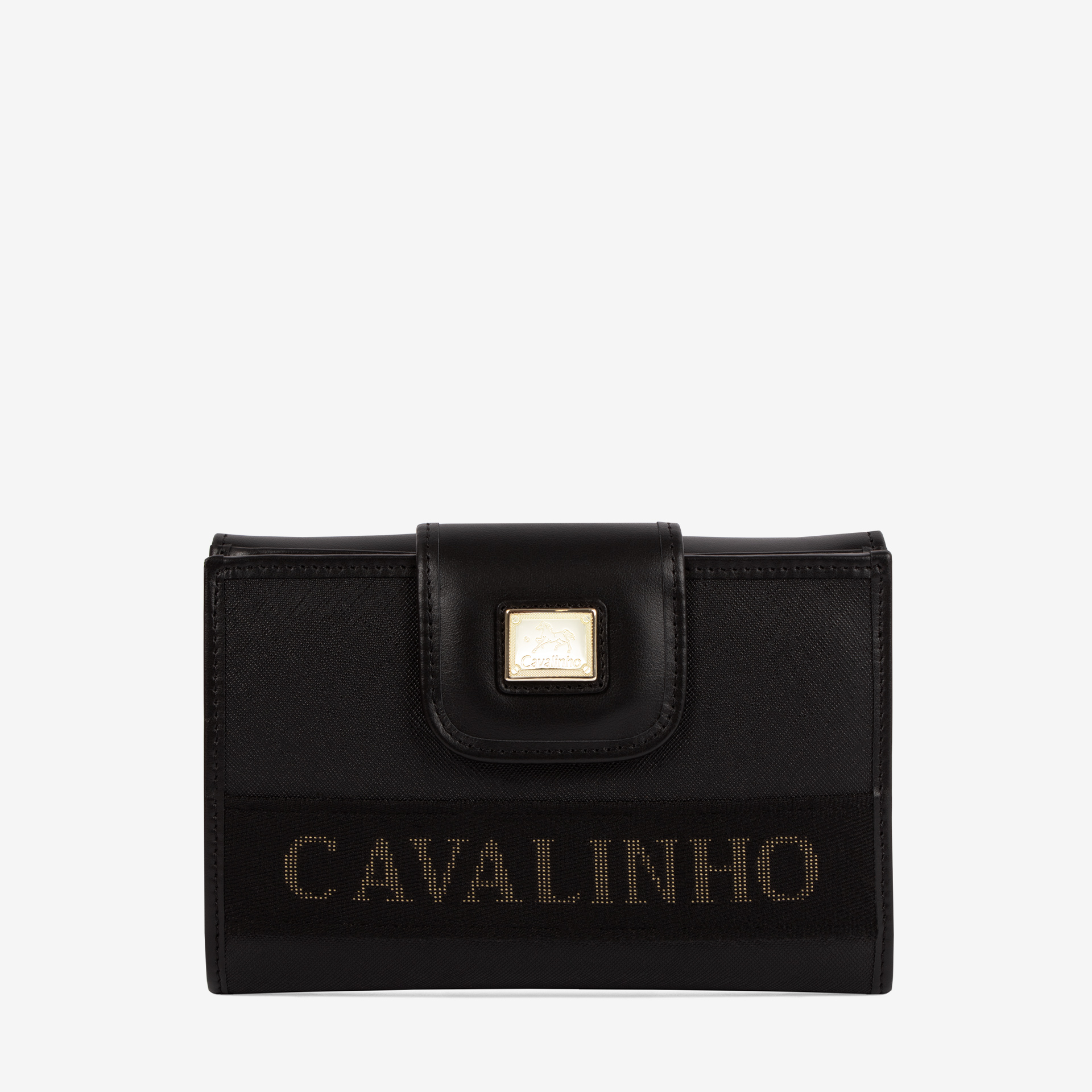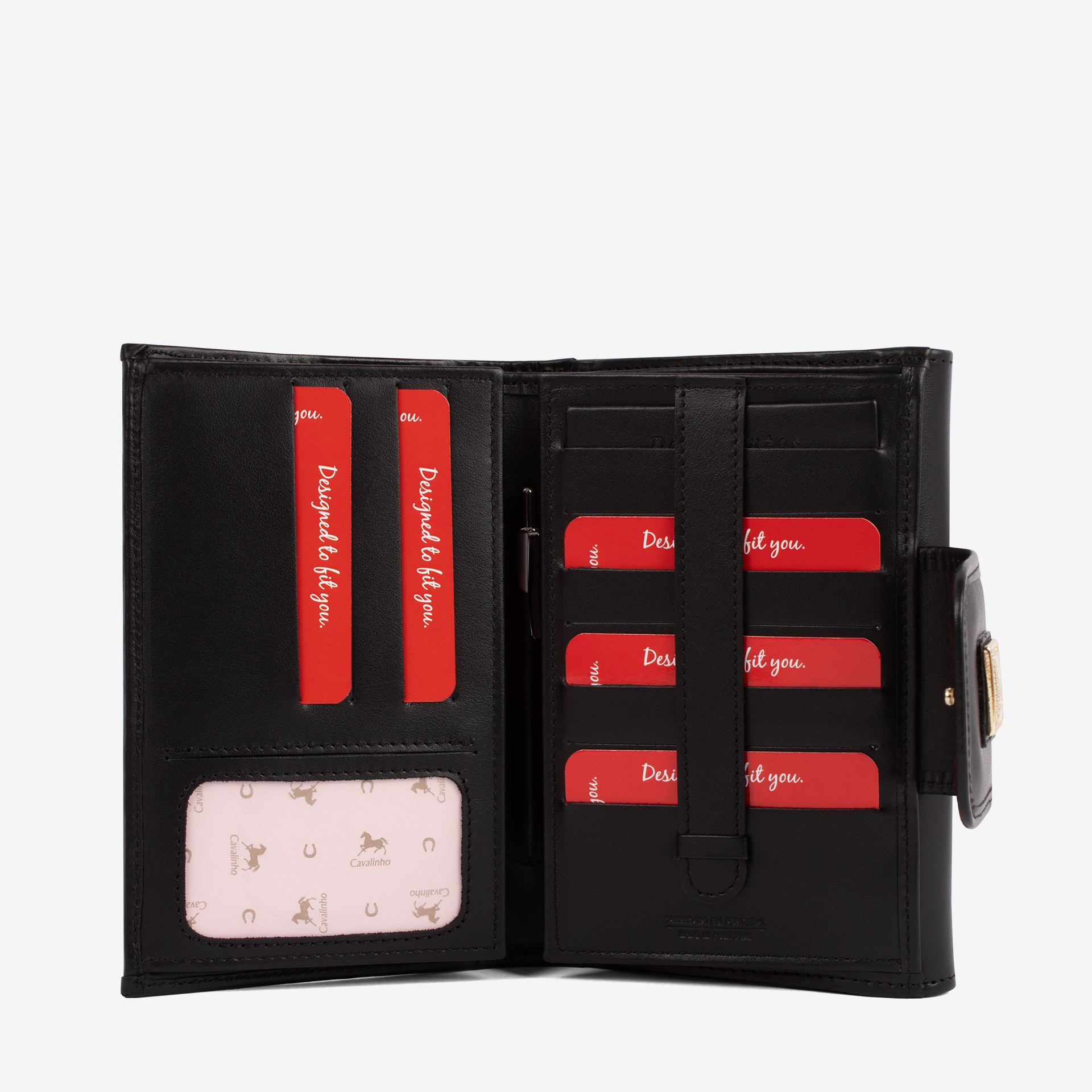 Espaço para 19 cartões, três micas grandes e uma mica pequena, uma divisão para documentos, uma divisão para notas e uma caneta.