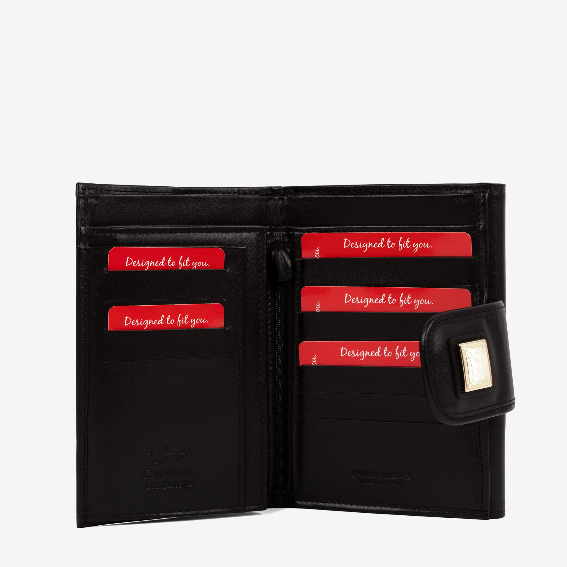 Espaço para 11 cartões, duas micas, três divisões para documentos uma delas com fecho de correr e duas divisões para notas.