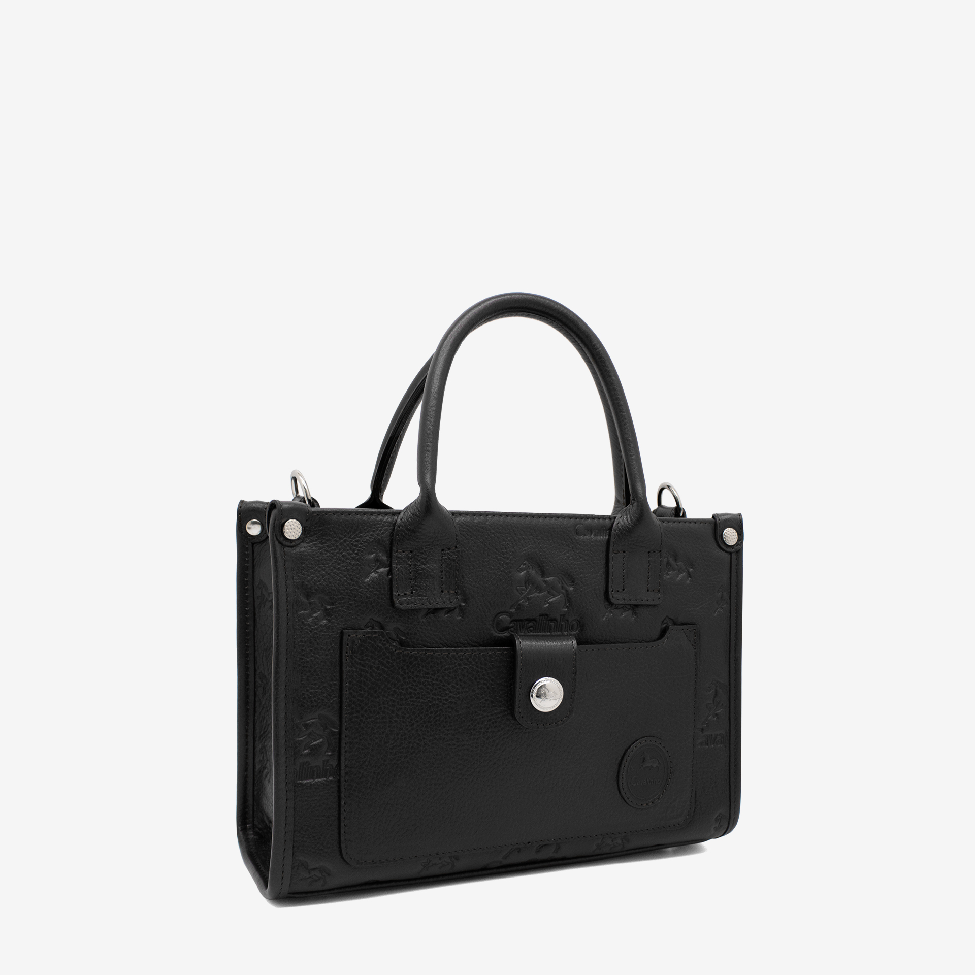 Asa dupla de mão em pele e alça de ombro e tiracolo ajustável e removível em pele.