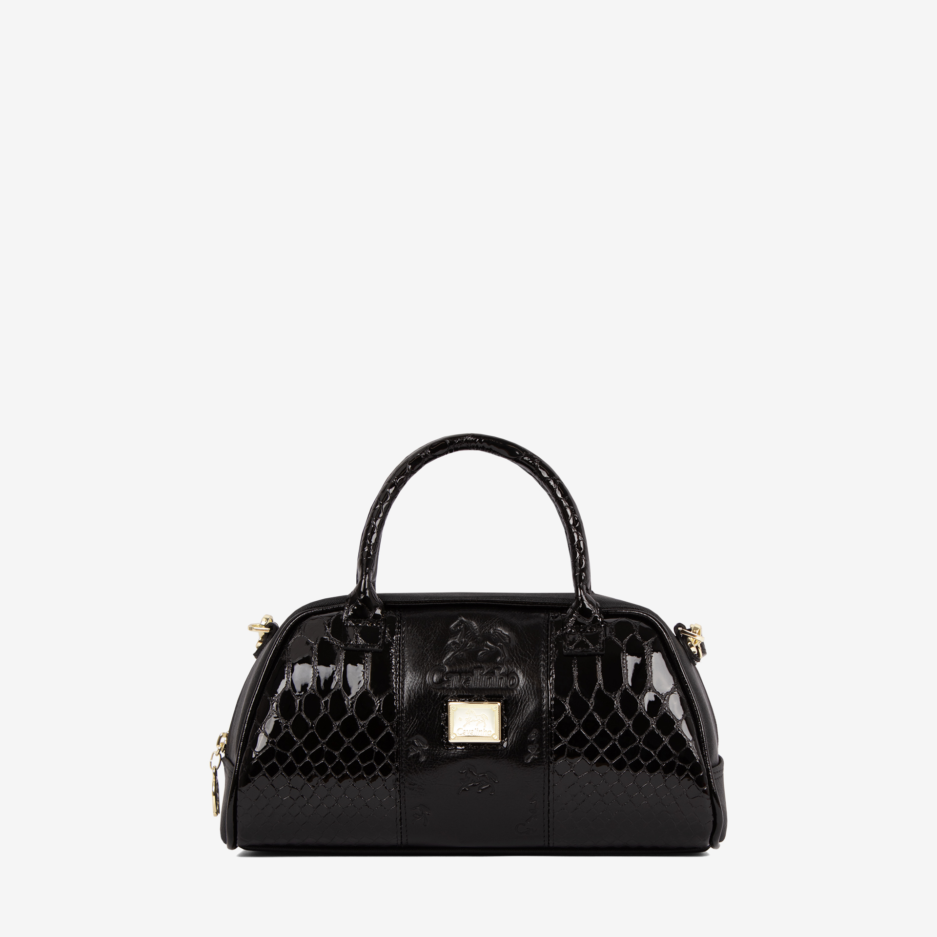 Asa dupla de mão em pele e alça de ombro e tiracolo ajustável e removível em pele.