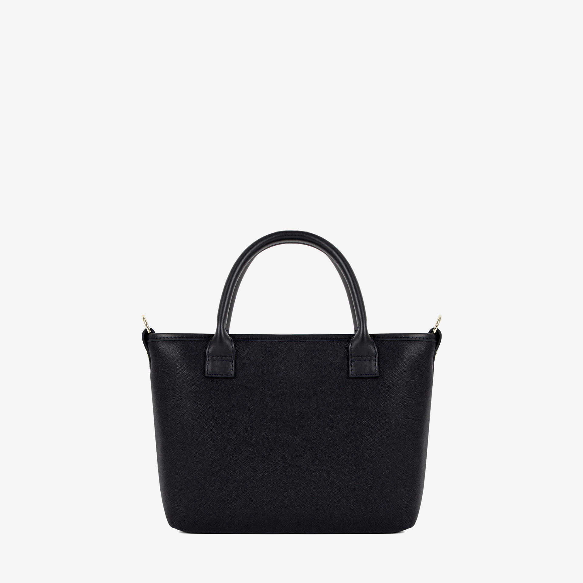 Asa dupla de mão em pele e alça de ombro e tiracolo removível em pele.