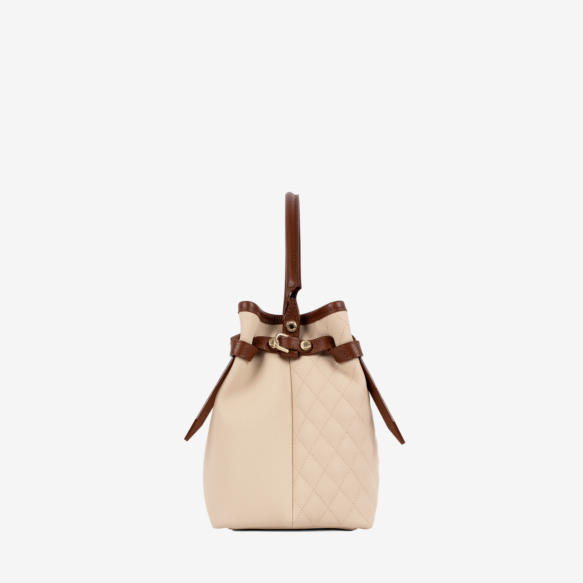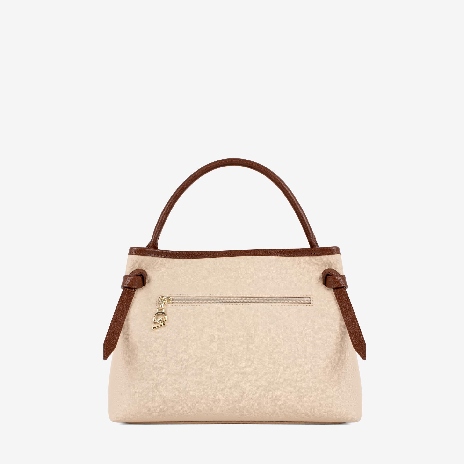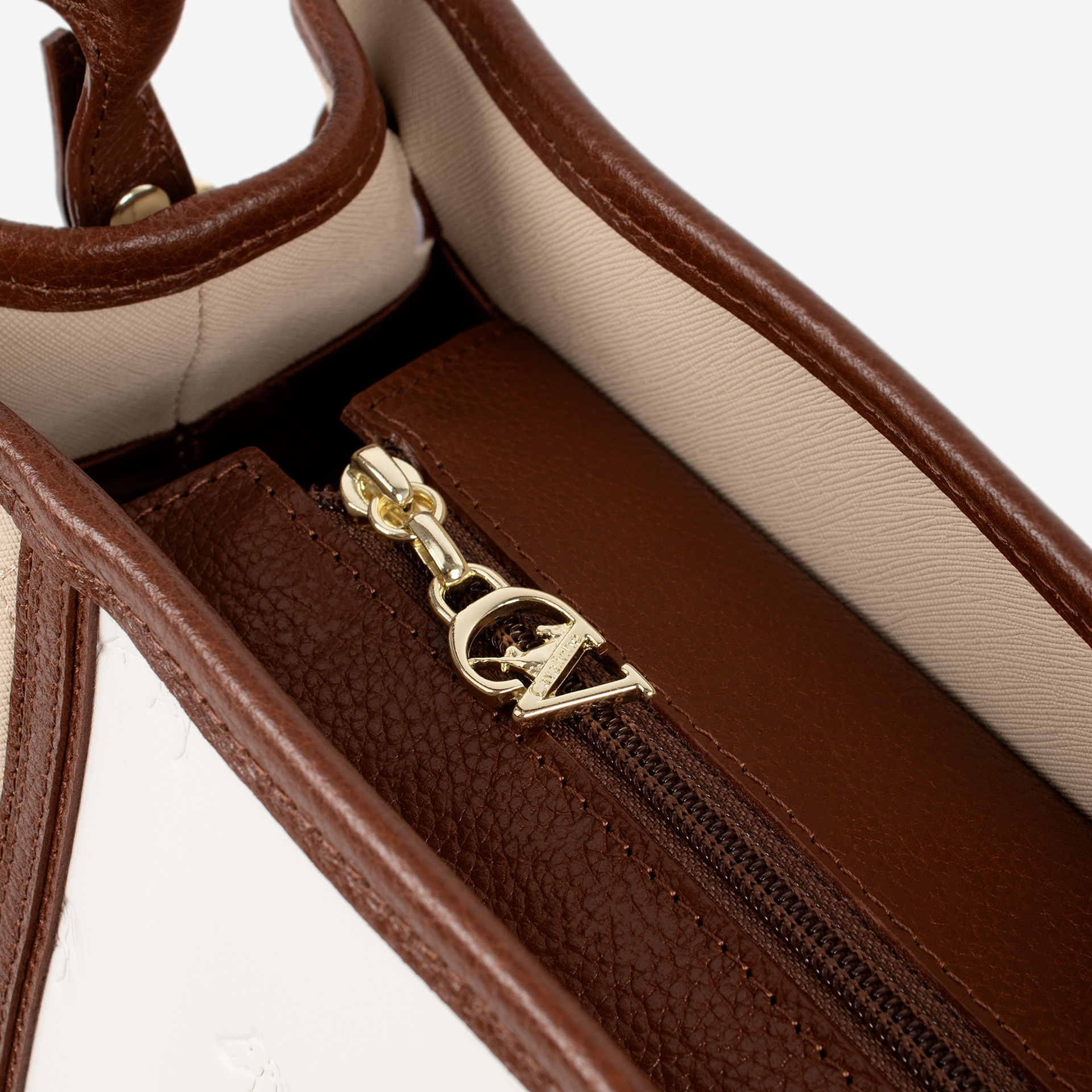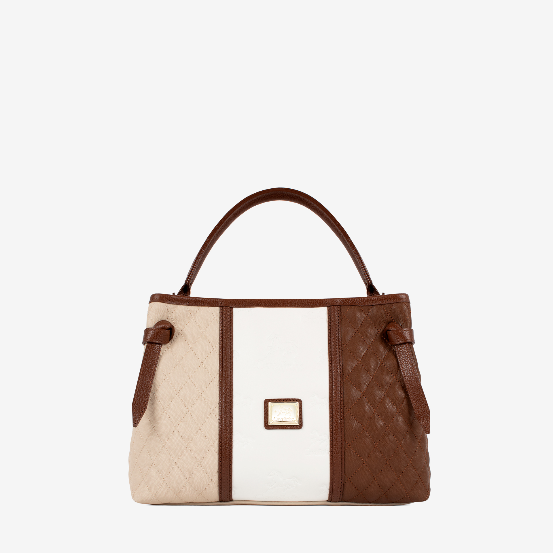 Mala da marca Cavalinho em tela bege e camel com detalhes em pele genuína branca e camel.
