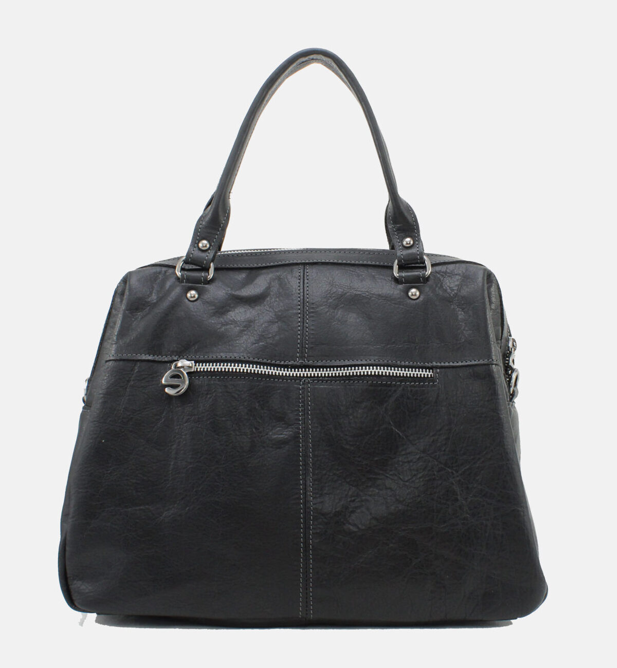 Asa dupla de mão e alça de ombro e tiracolo ajustável e removível em pele.