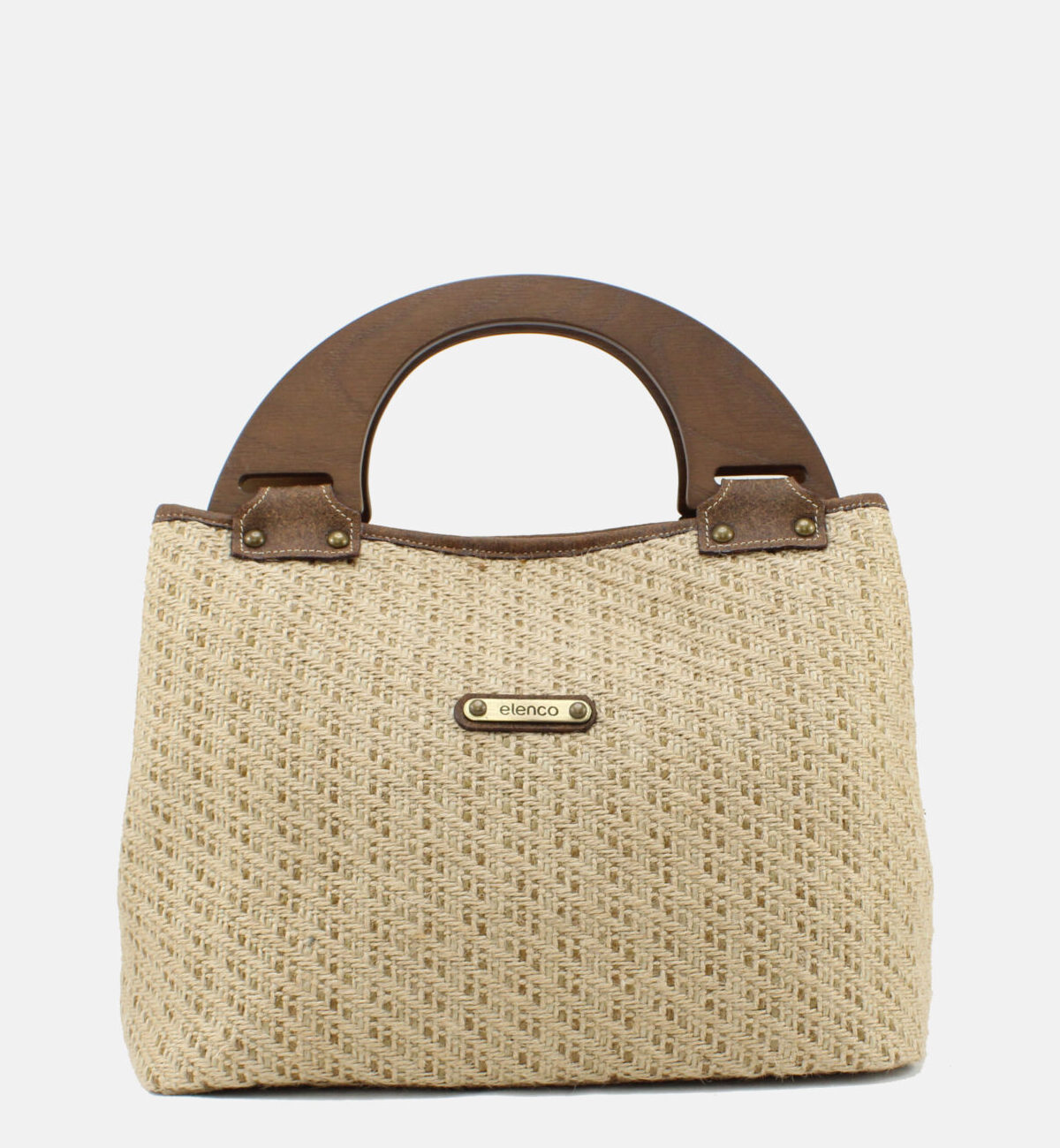 Mala da marca Elenco em tecido de ráfia com pele na cor bege.