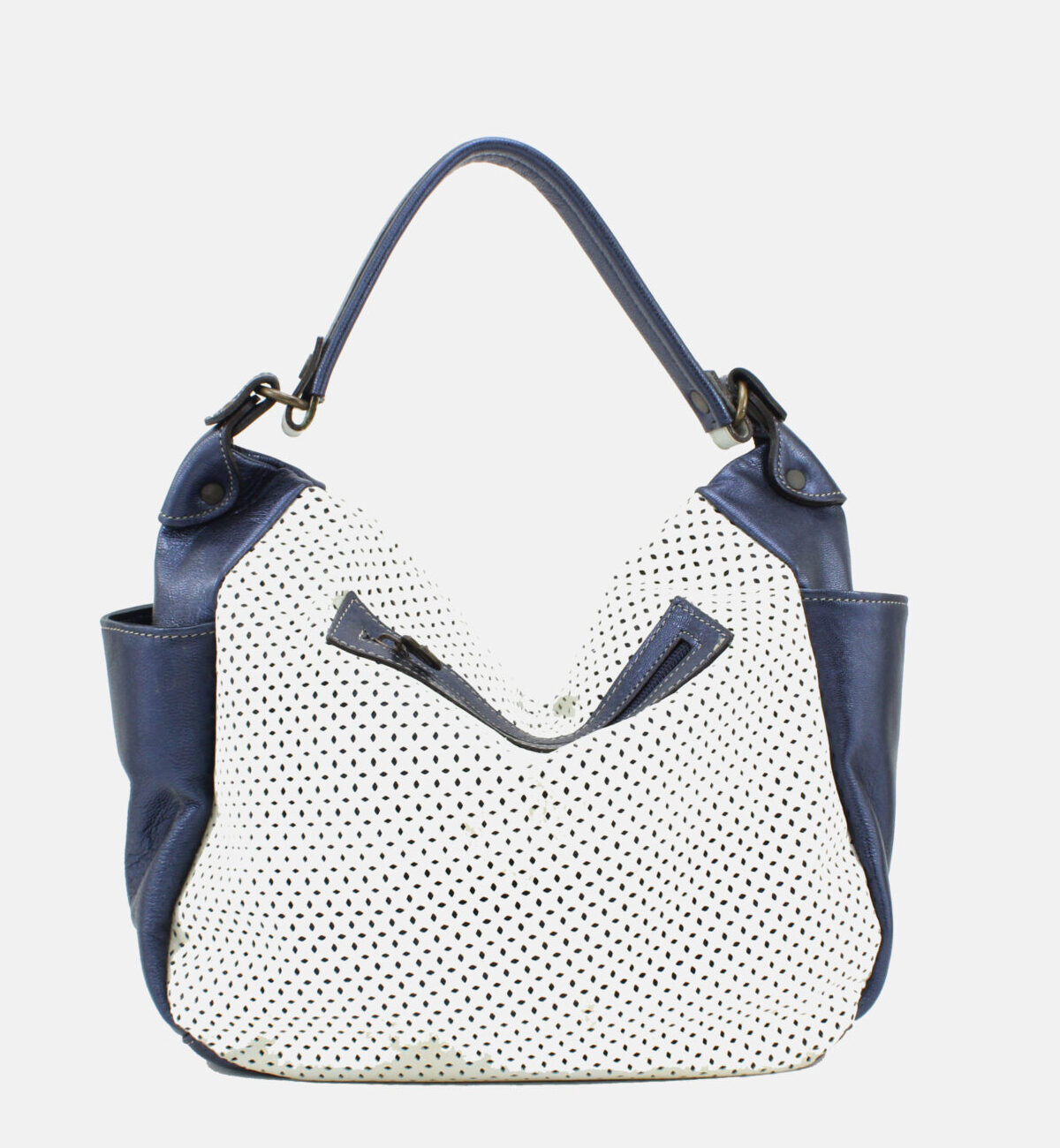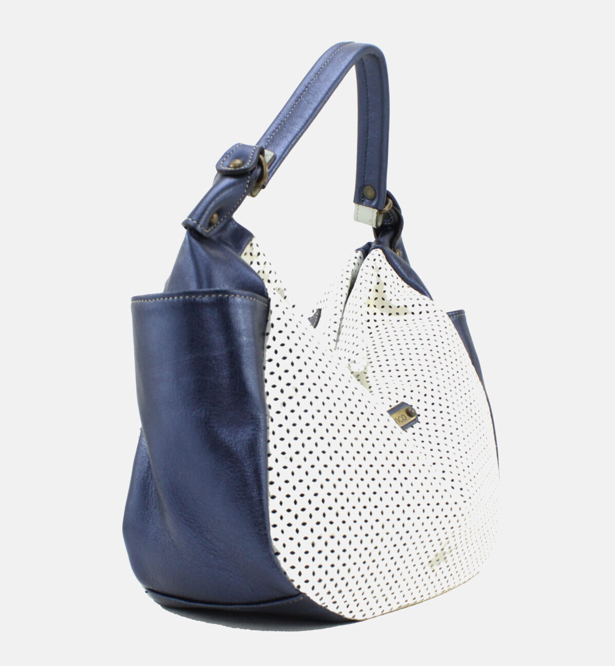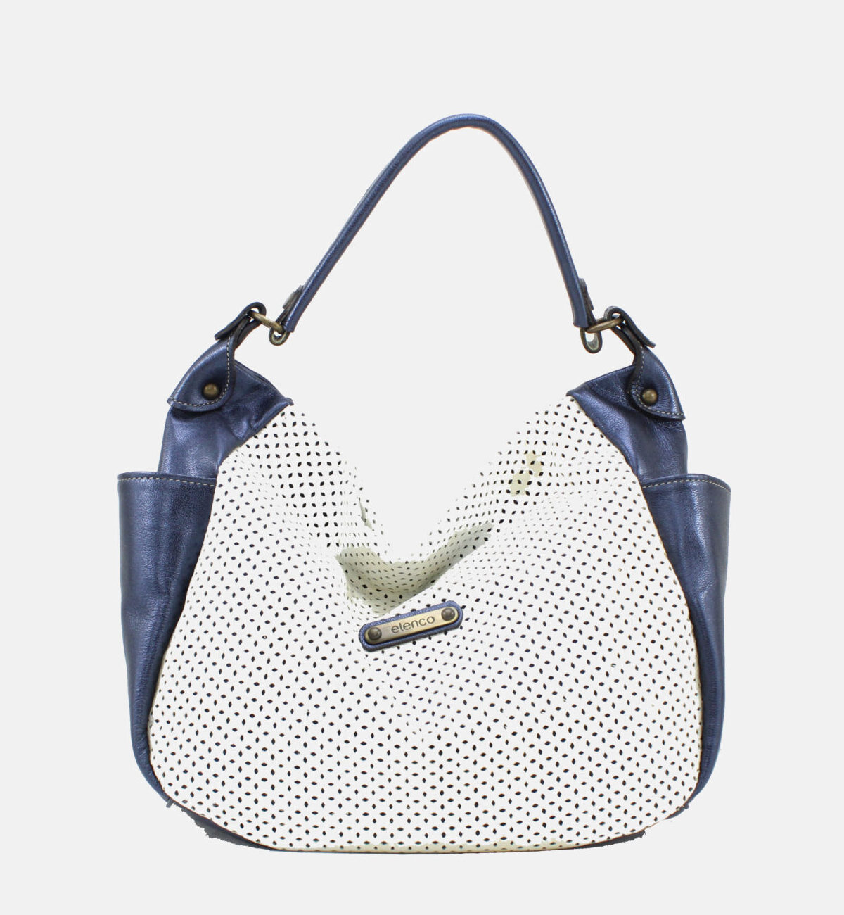 Mala da marca Elenco em pele genuína nas cores azul e branco.