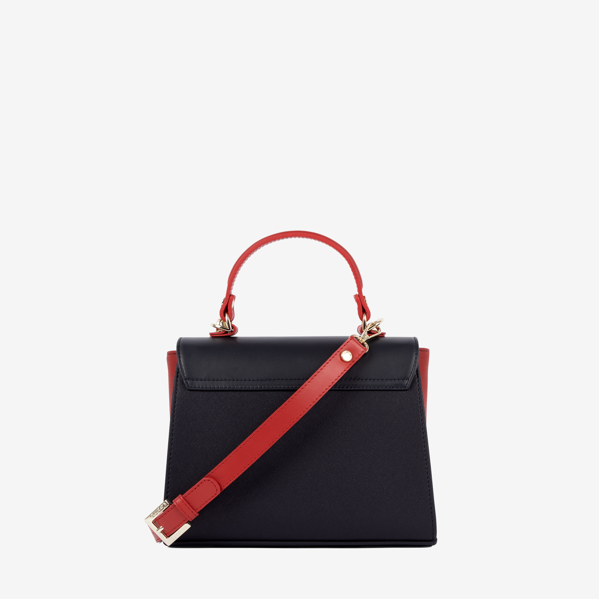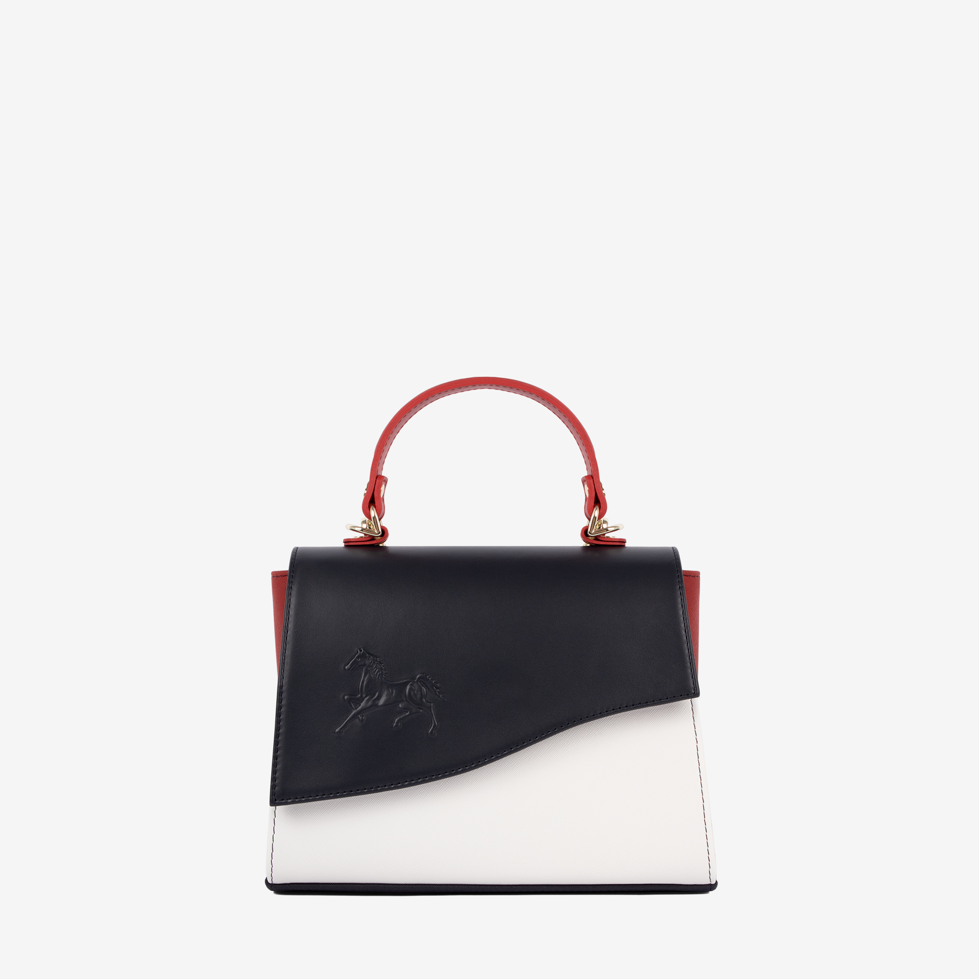 Uma asa de mão em pele e alça de tiracolo ajustável e removível em pele.