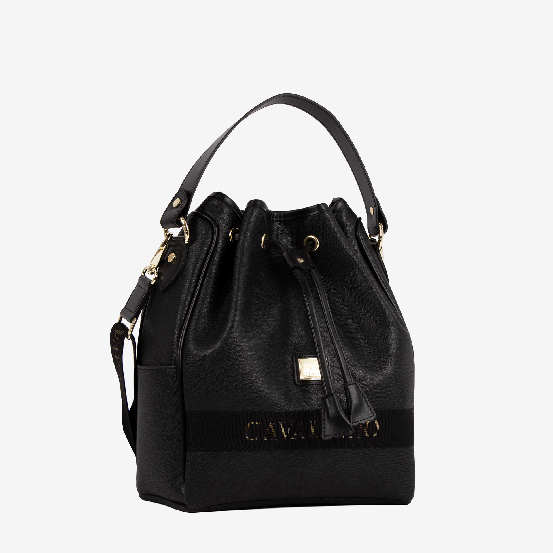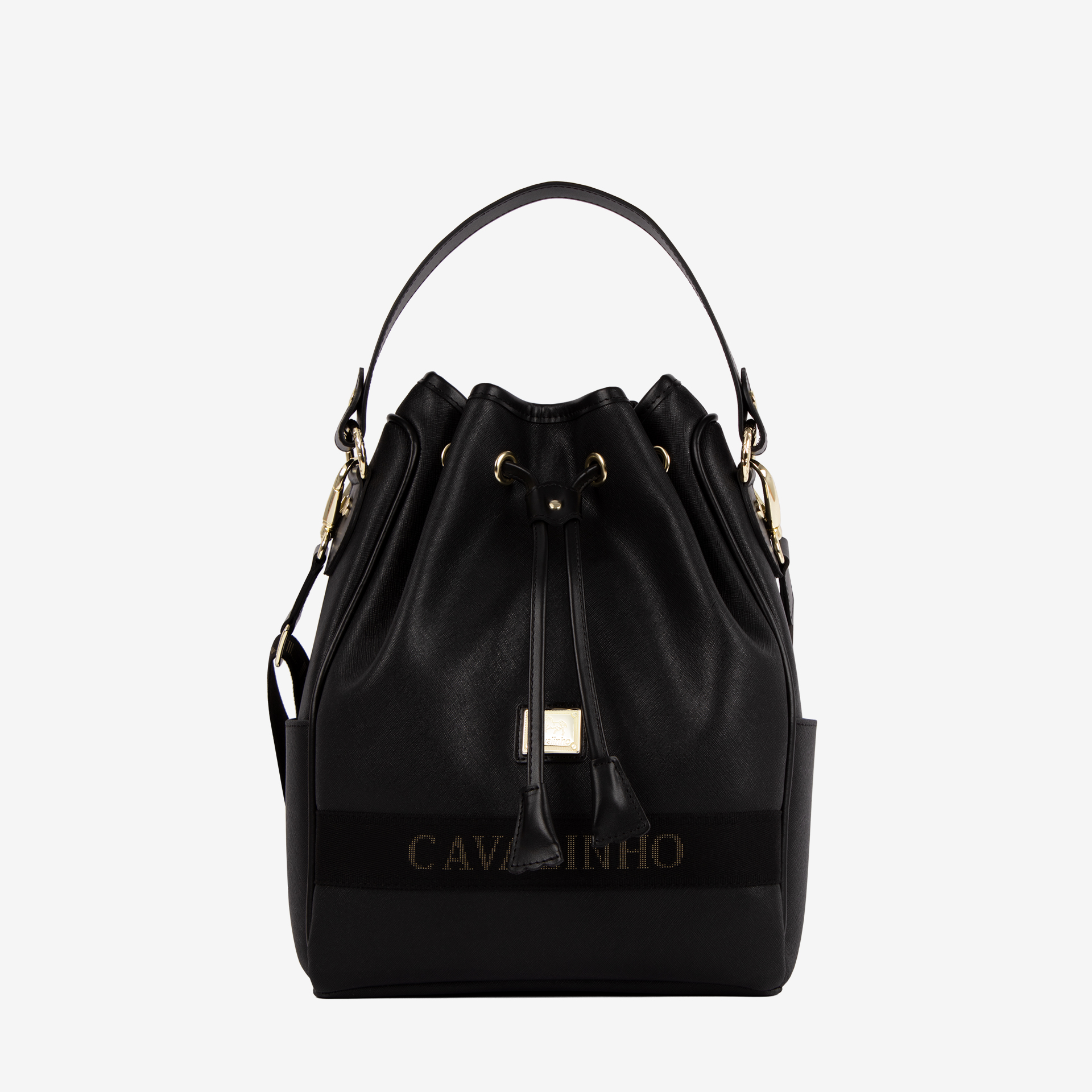 Mala da marca Cavalinho em tela preta com detalhes em pele genuína preta. Abertura principal com fecho magnético e cordões ajustáveis. Dois bolsos pequenos no interior um com fecho de correr. Três bolsos exteriores um com fecho de correr. Uma asa de mão em pele e uma alça ajustável e removível de ombro e tiracolo em poliéster ( nylon). Aplicações em metal dourado antialérgico. Forro em tecido personalizado.