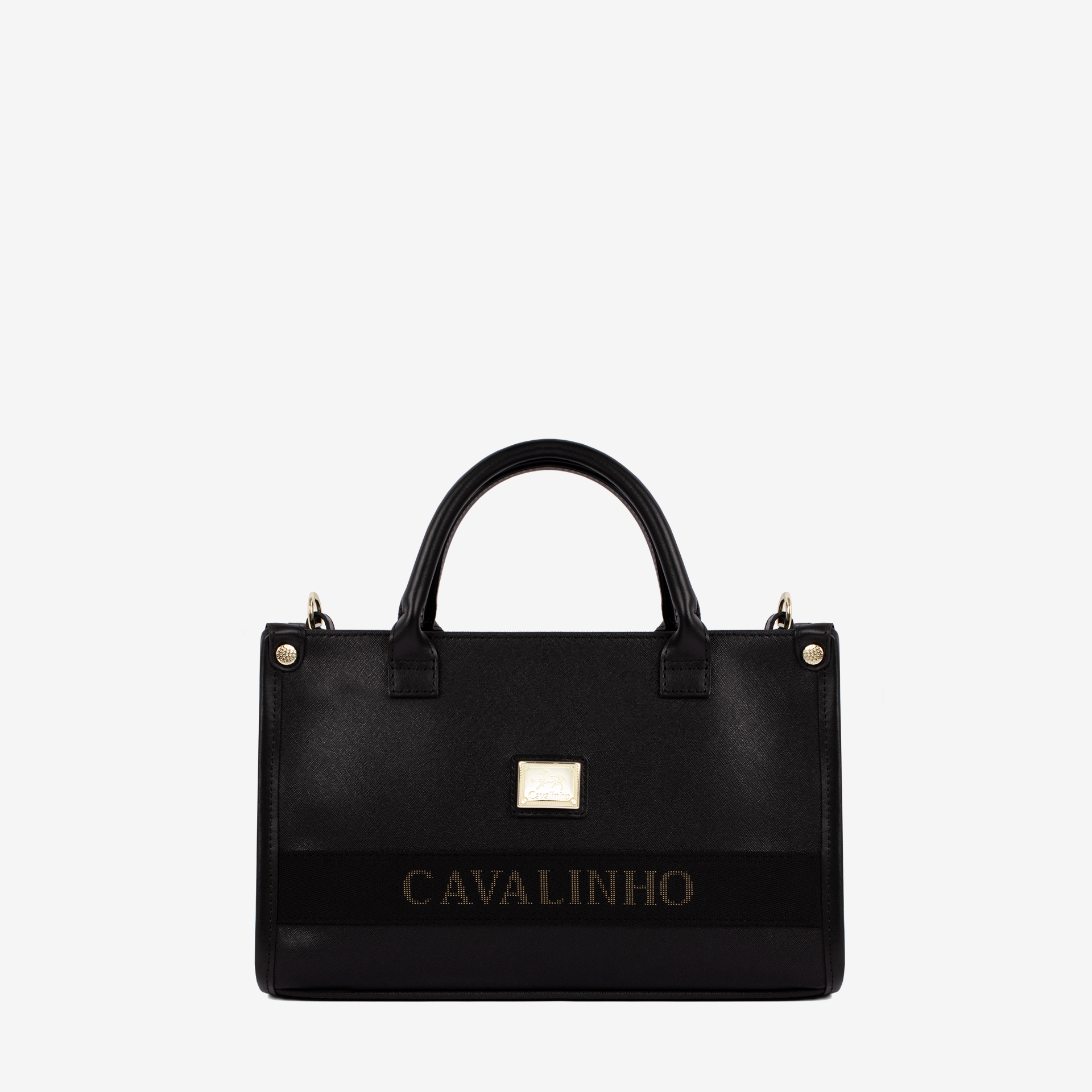 Mala da marca Cavalinho em tela preta com detalhes em pele genuína preta. Abertura principal com fecho de correr. Dois bolsos pequenos no interior um com fecho de correr. Bolso exterior com fecho de correr. Asa dupla de mão em pele e alça de ombro e tiracolo ajustável e removível em poliéster. Aplicações em metal dourado antialérgico. Forro em tecido personalizado.