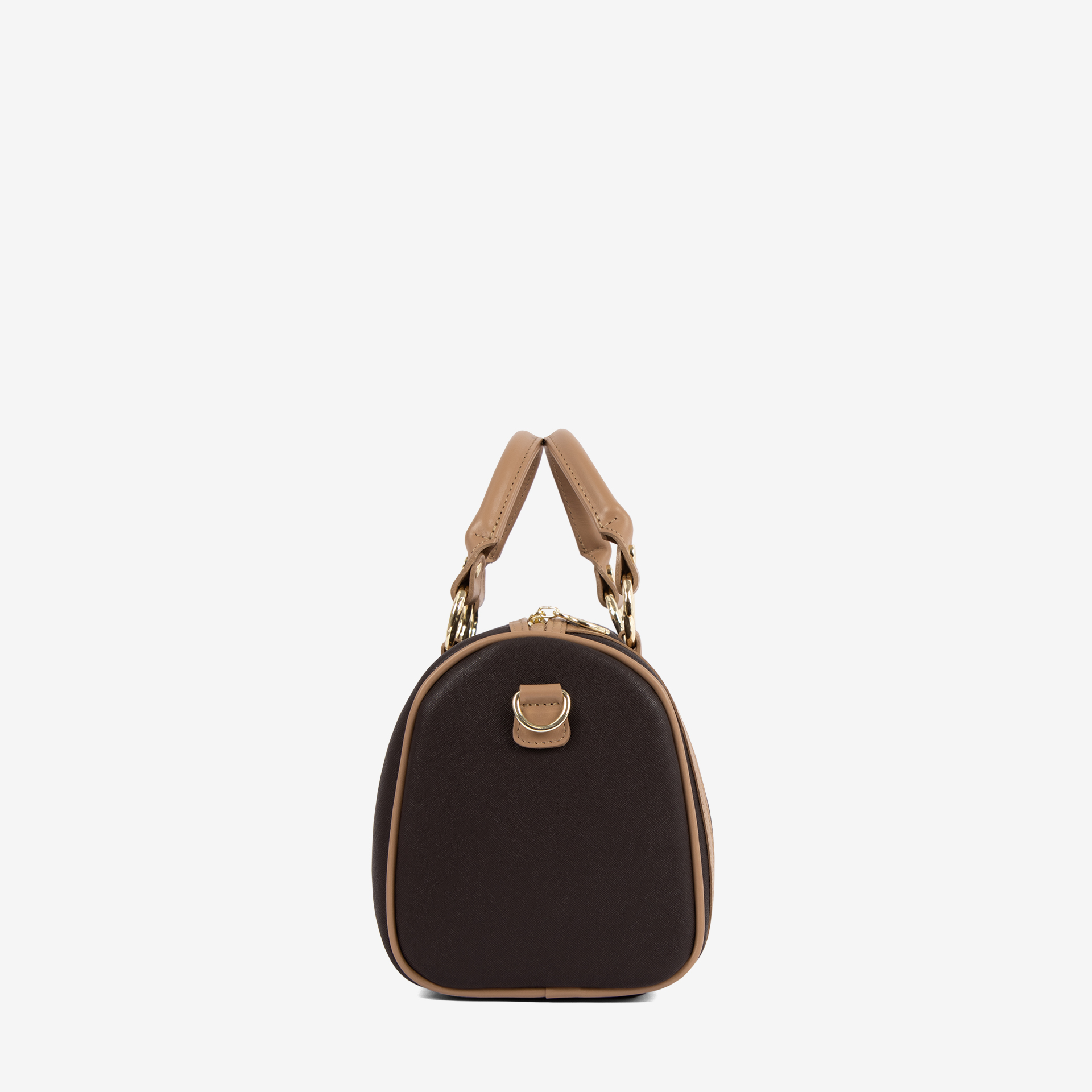 Mala da marca Cavalinho em tela castanha com detalhes em pele genuína bege. Abertura principal com fecho de correr. Dois bolsos pequenos no interior um com fecho de correr.  Duas asas de mão e alça de ombro e tiracolo removível em poliéster. Aplicações em metal dourado antialérgico. Forro em tecido personalizado. Dimensões Aproximadas: Altura 18 cm / Largura 28 cm / Base 28 cm X 14 cm.