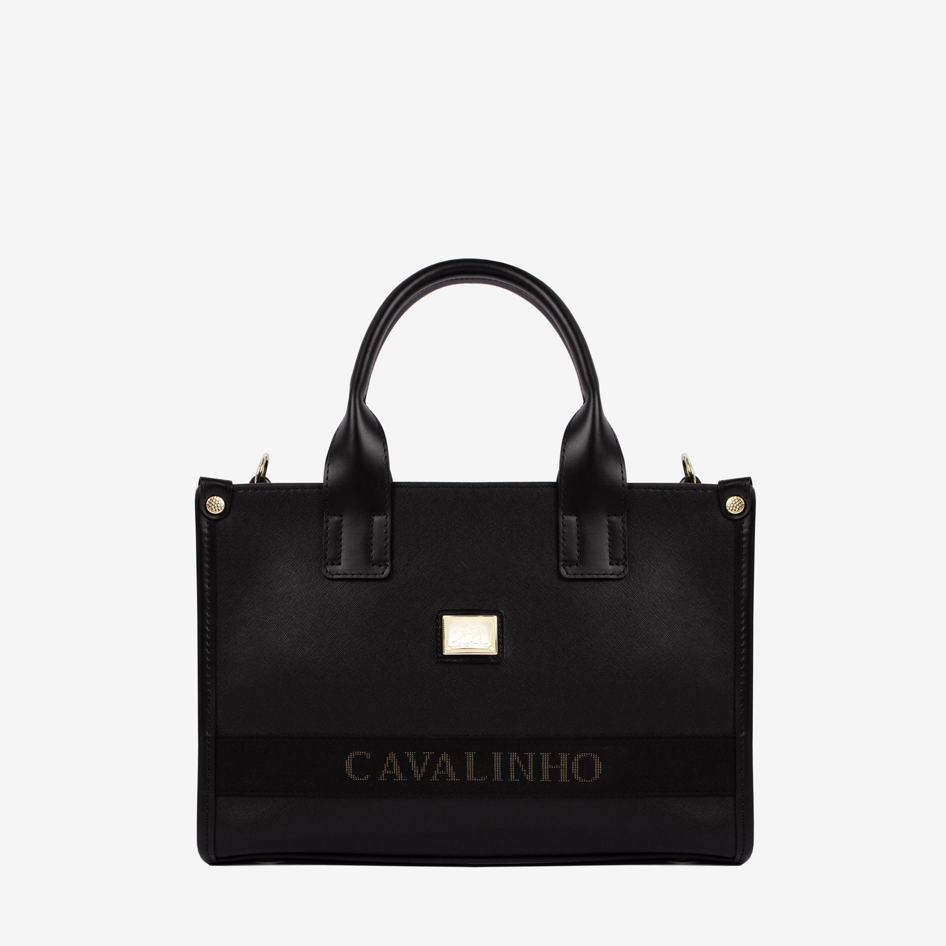Mala da marca Cavalinho em tela preta com detalhes em pele genuína preta. Abertura principal com fecho de correr. Dois bolsos pequenos no interior um com fecho de correr. Asa dupla de mão em pele e alça de ombro e tiracolo ajustável e removível em poliéster. Aplicações em metal dourado antialérgico. Forro em tecido personalizado.