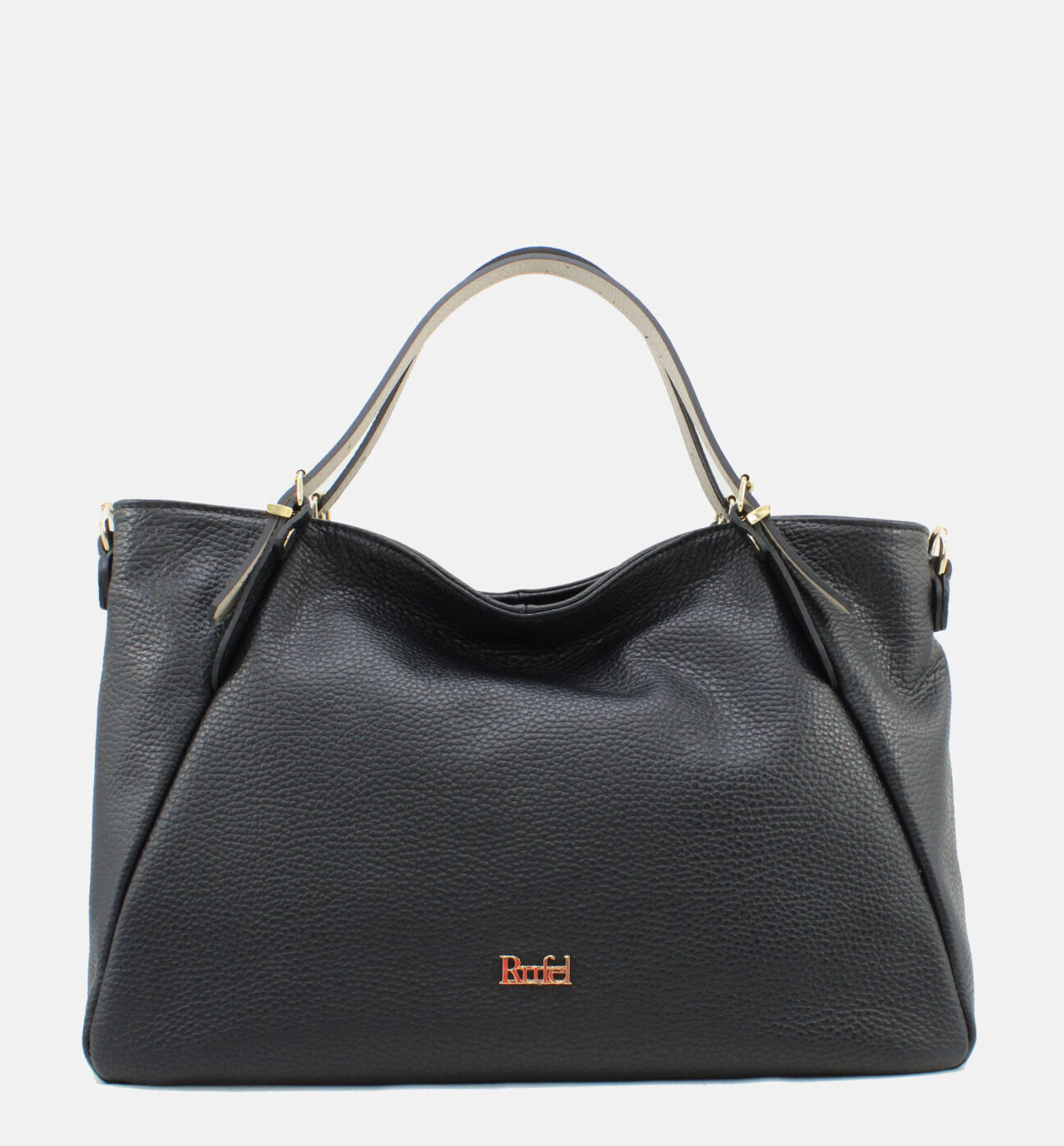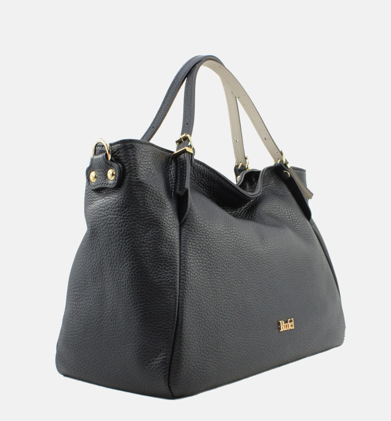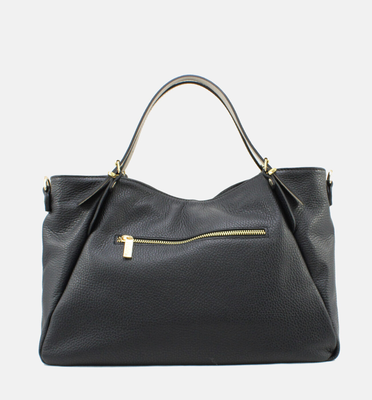 Asa dupla de mão e alça de ombro e tiracolo ajustável e removível em pele.