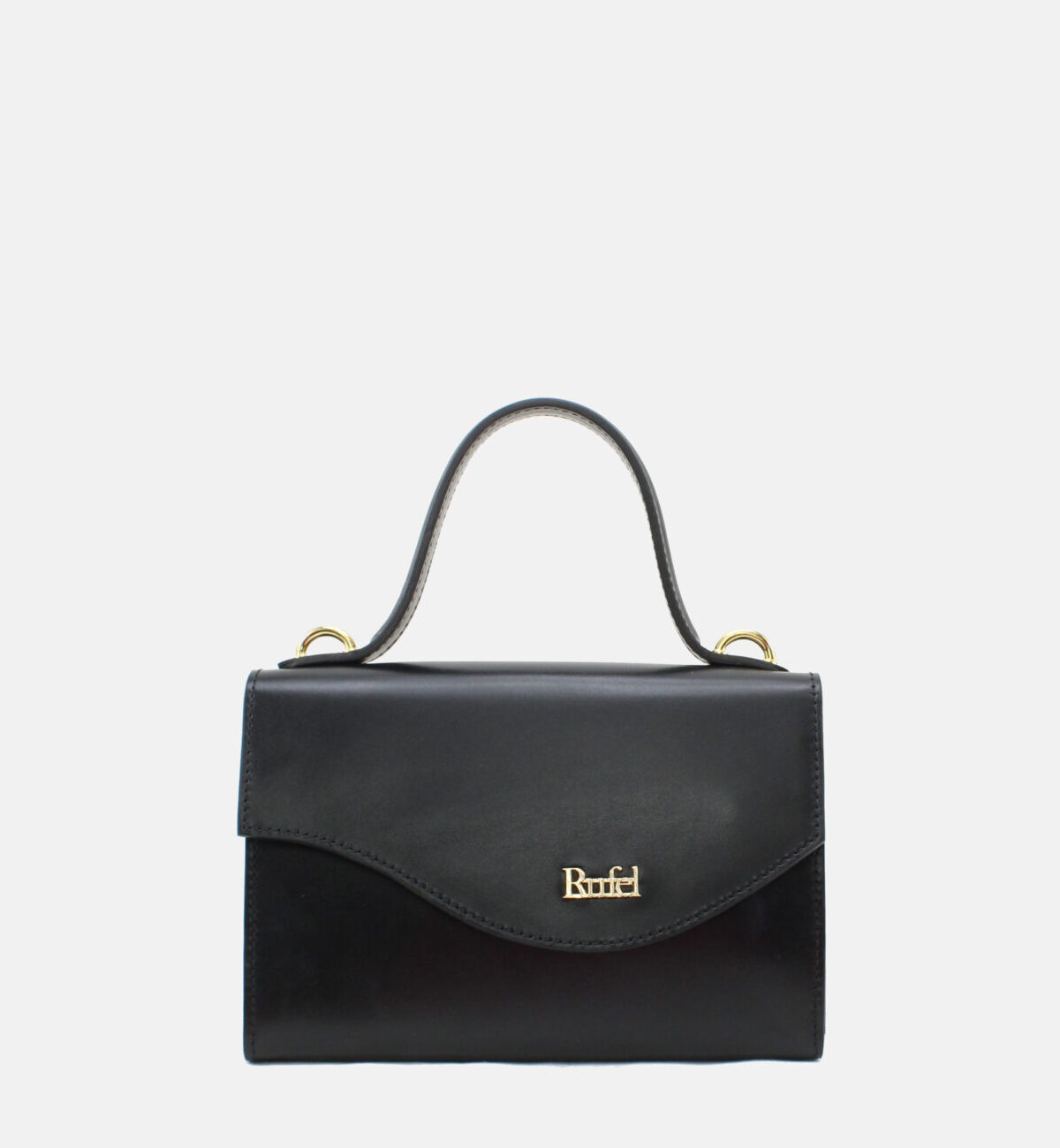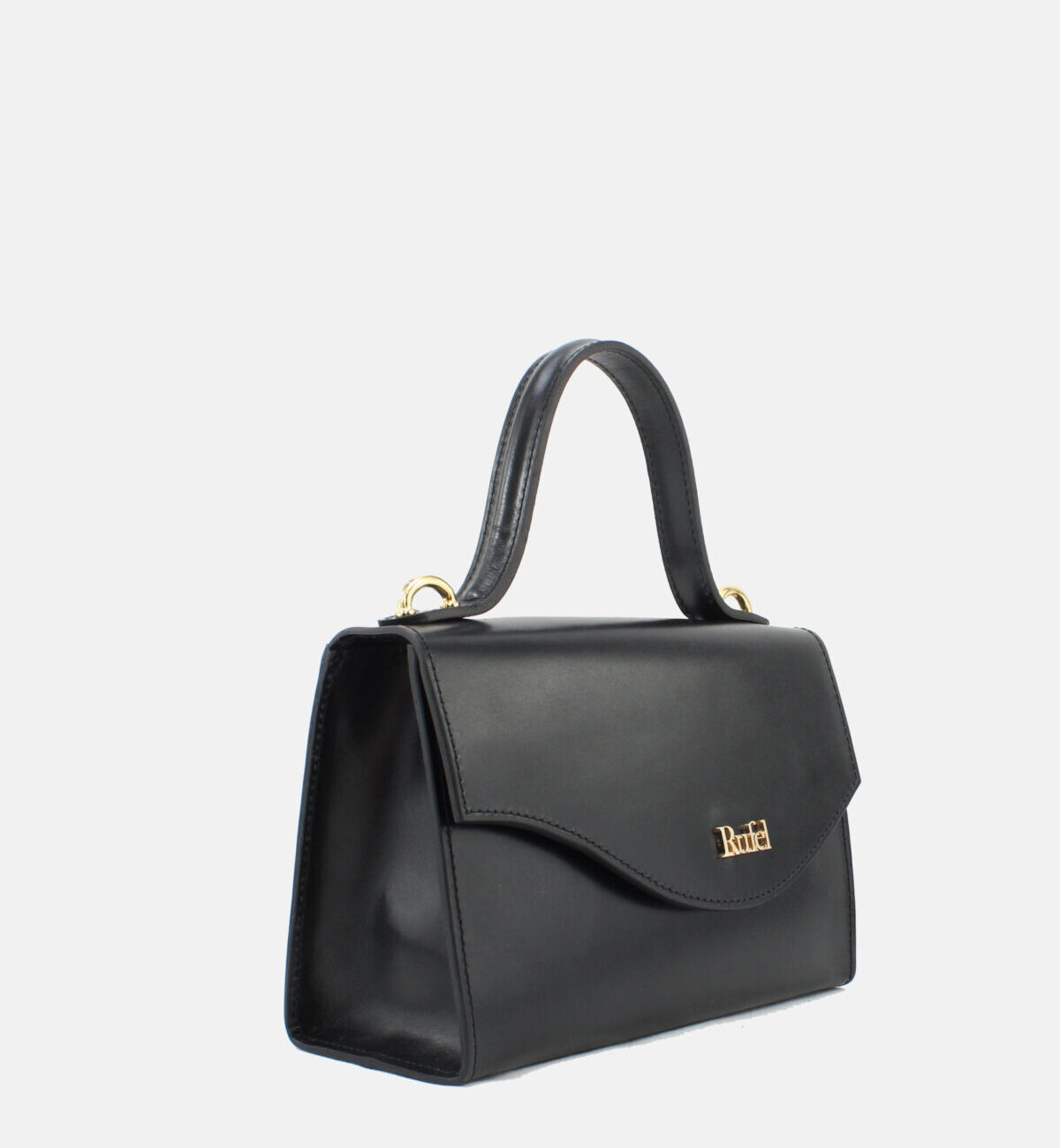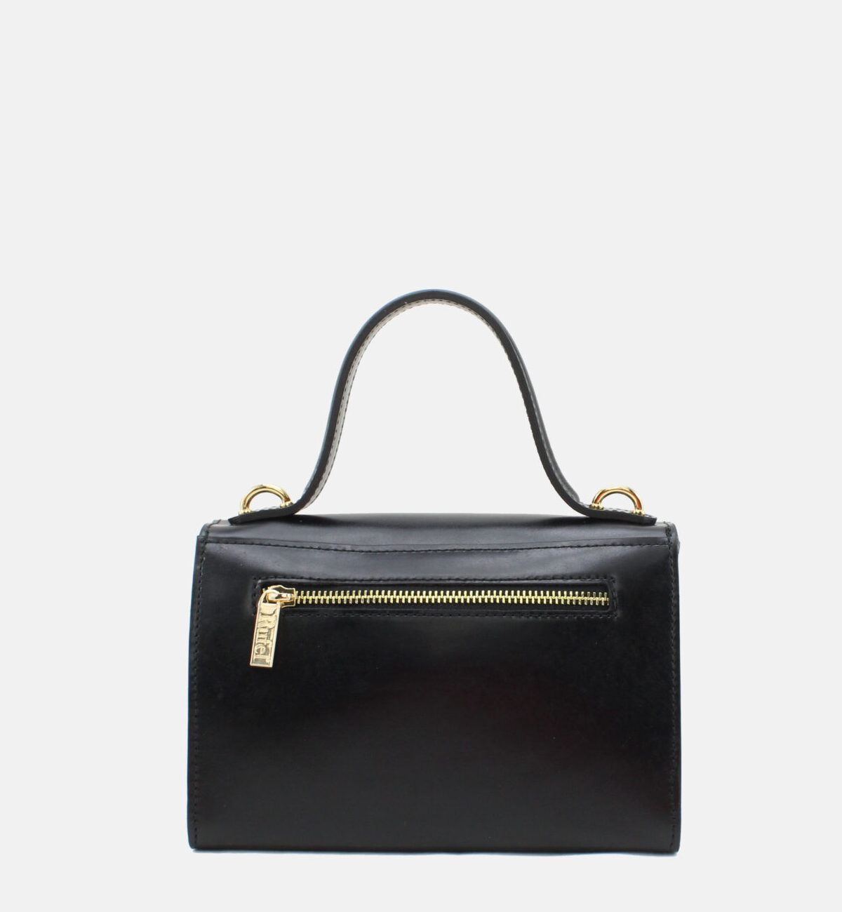 Asa de mão em pele e alça de ombro e tiracolo ajustável e removível em pele.