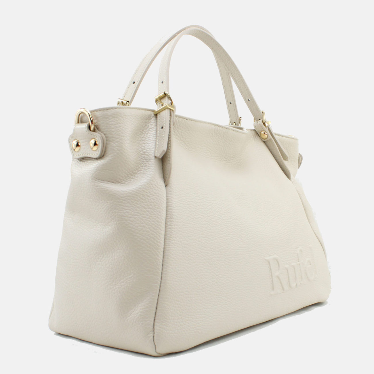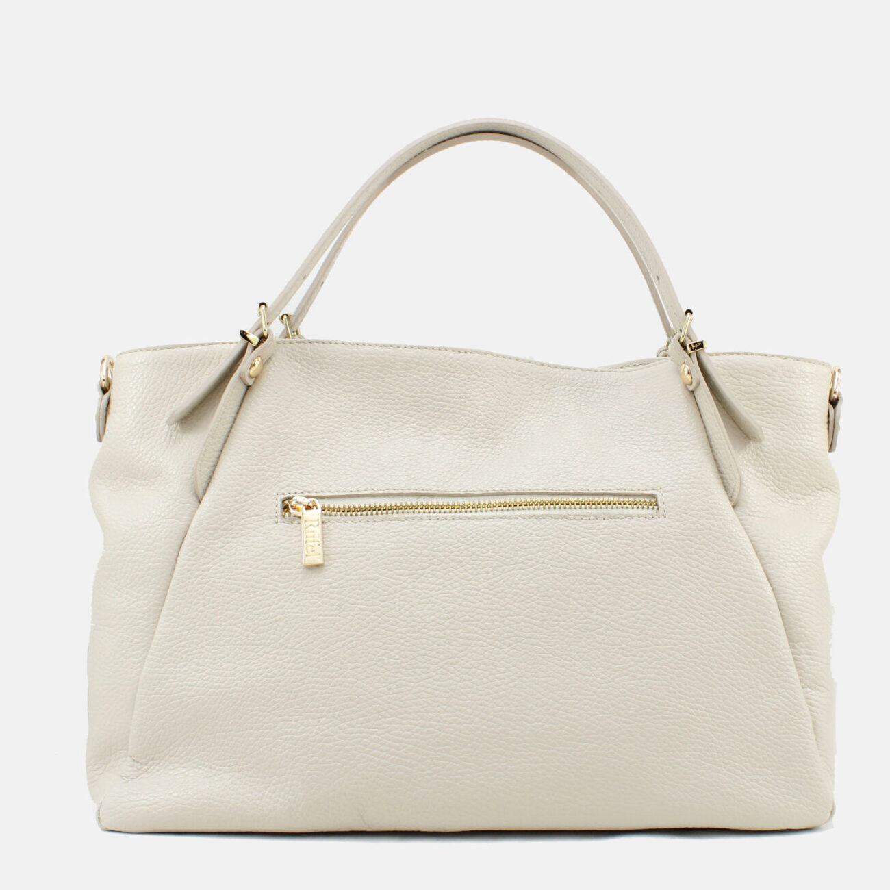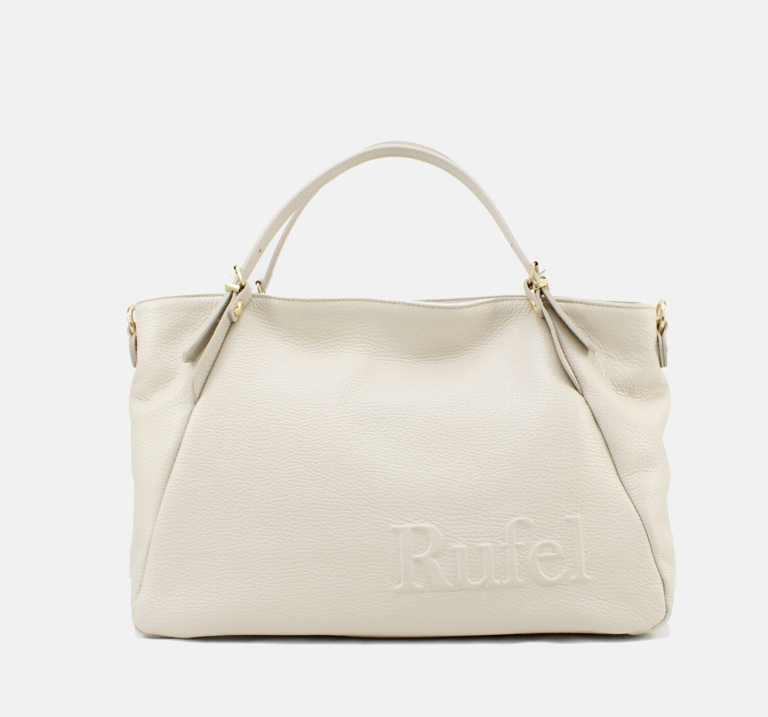 Asa dupla de mão e alça de ombro e tiracolo ajustável e removível em pele.