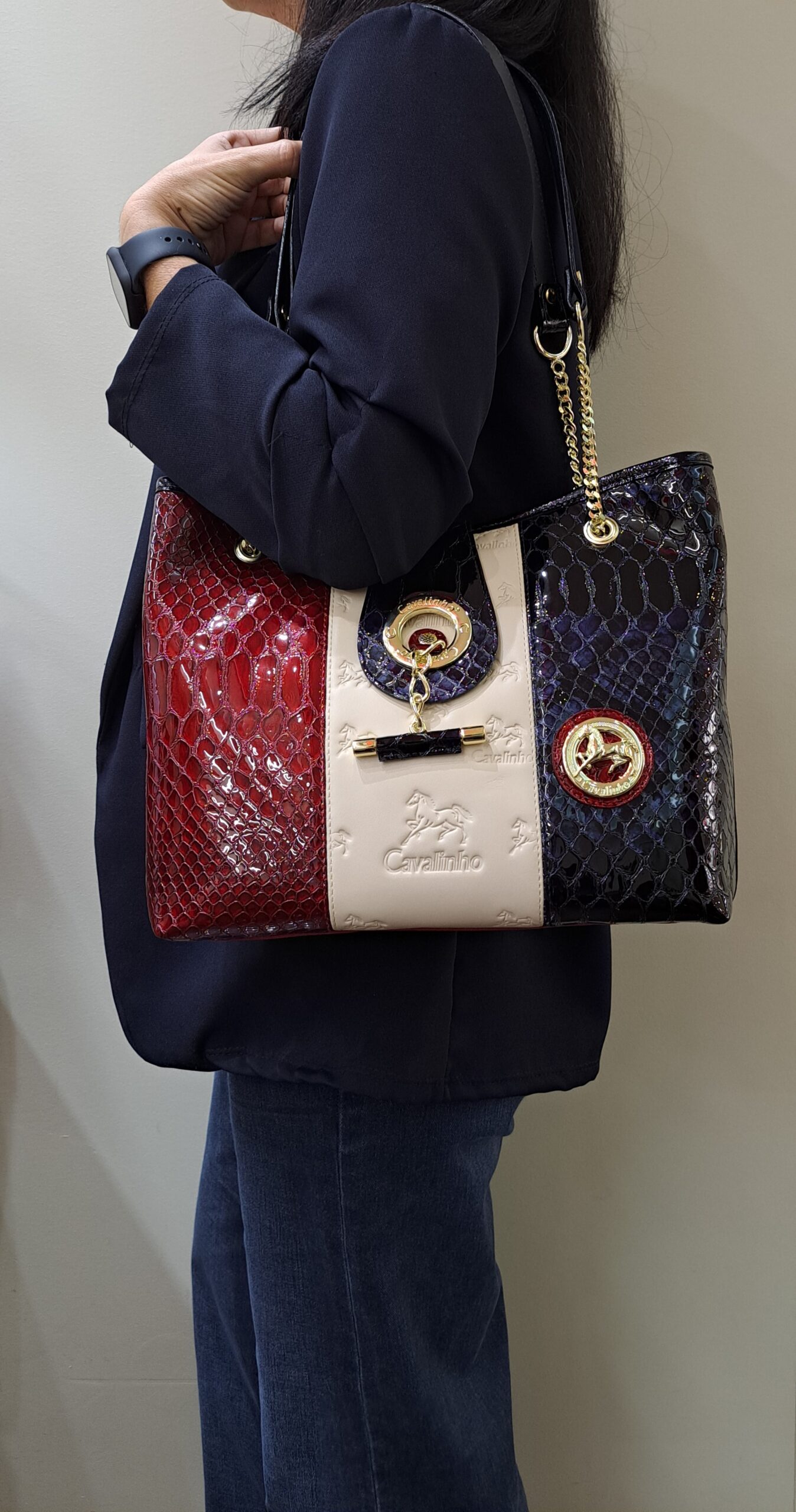 Mala da marca Cavalinho em tela vermelha com detalhes em pele genuína vermelha, azul e bege.