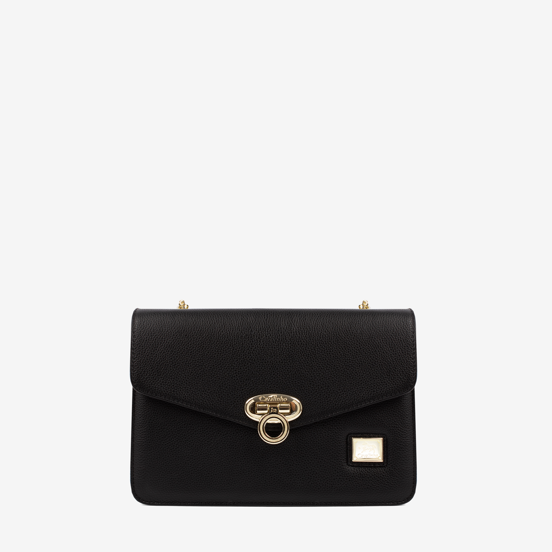 Alça de ombro e tiracolo em pele e corrente ajustável.