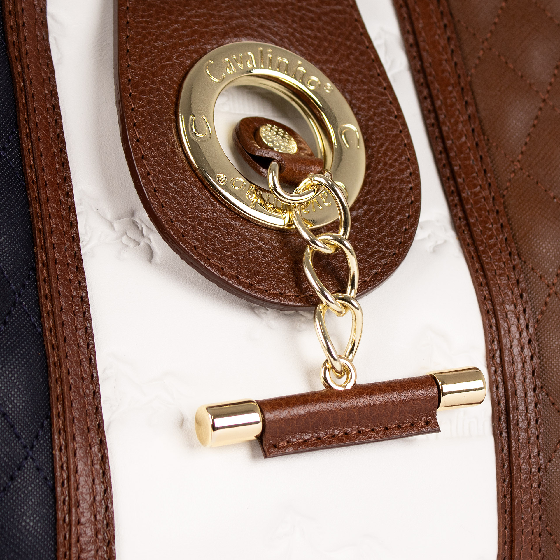 Mala da marca Cavalinho em tela azul e camel com detalhes em pele genuína camel e branco.