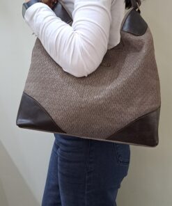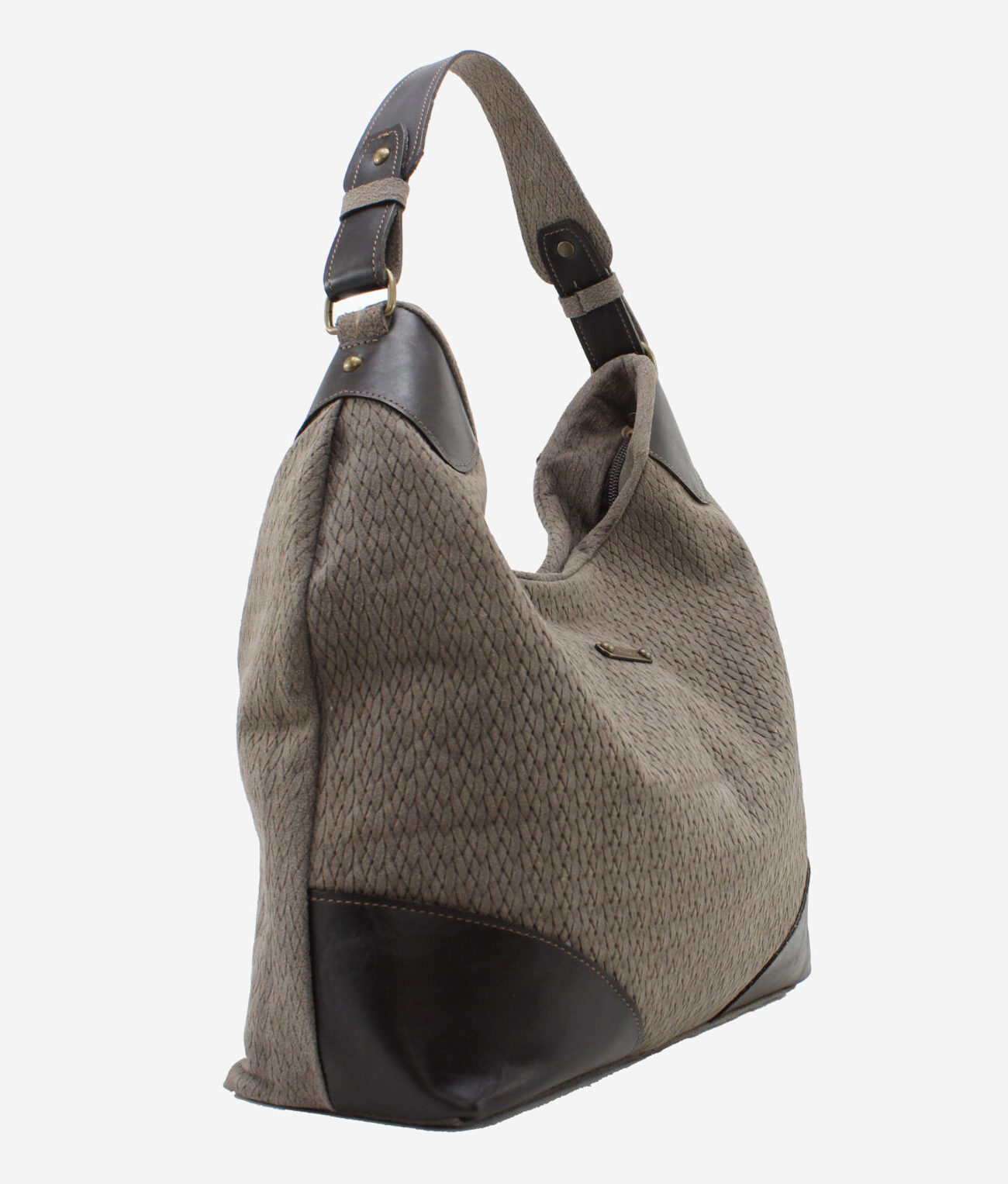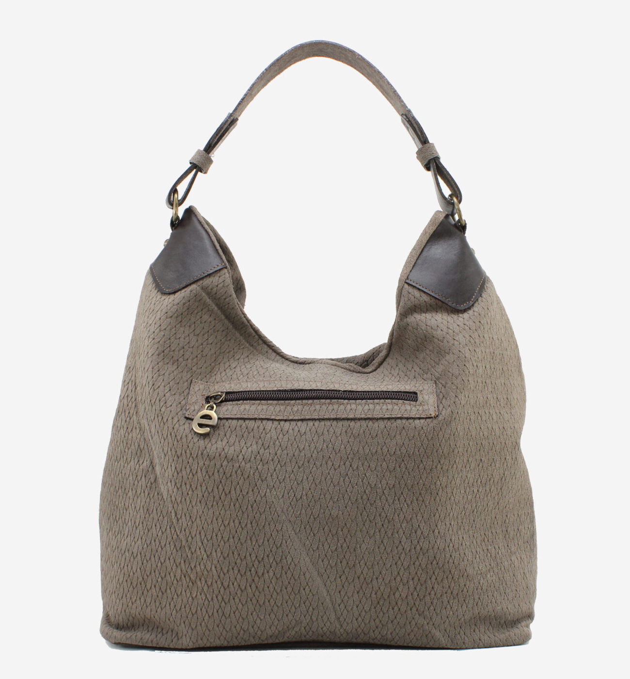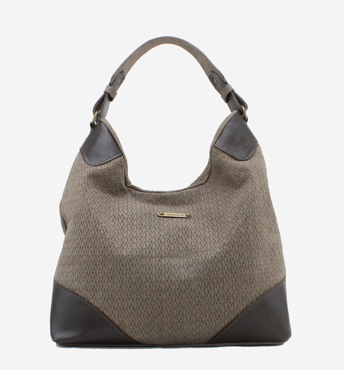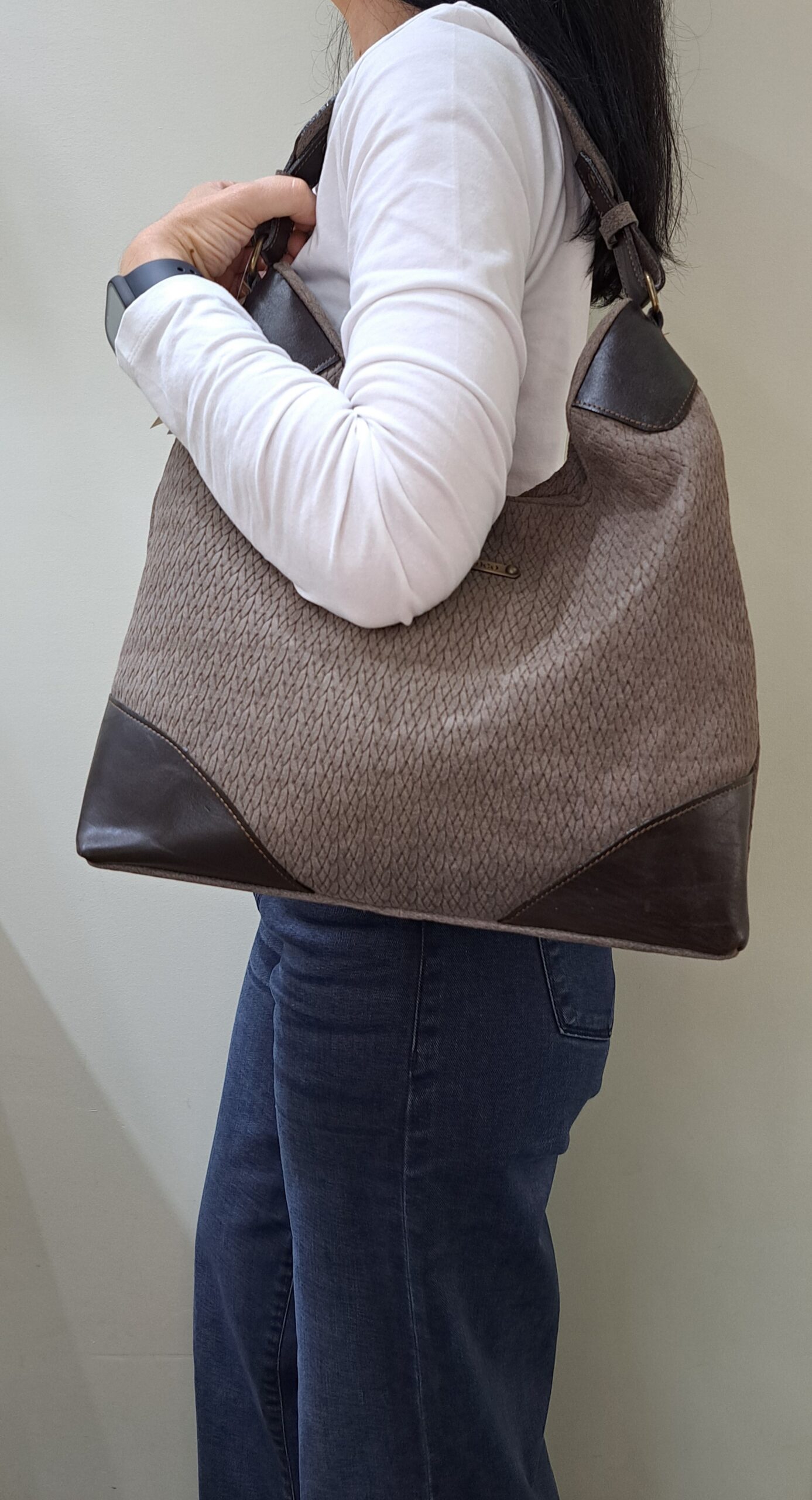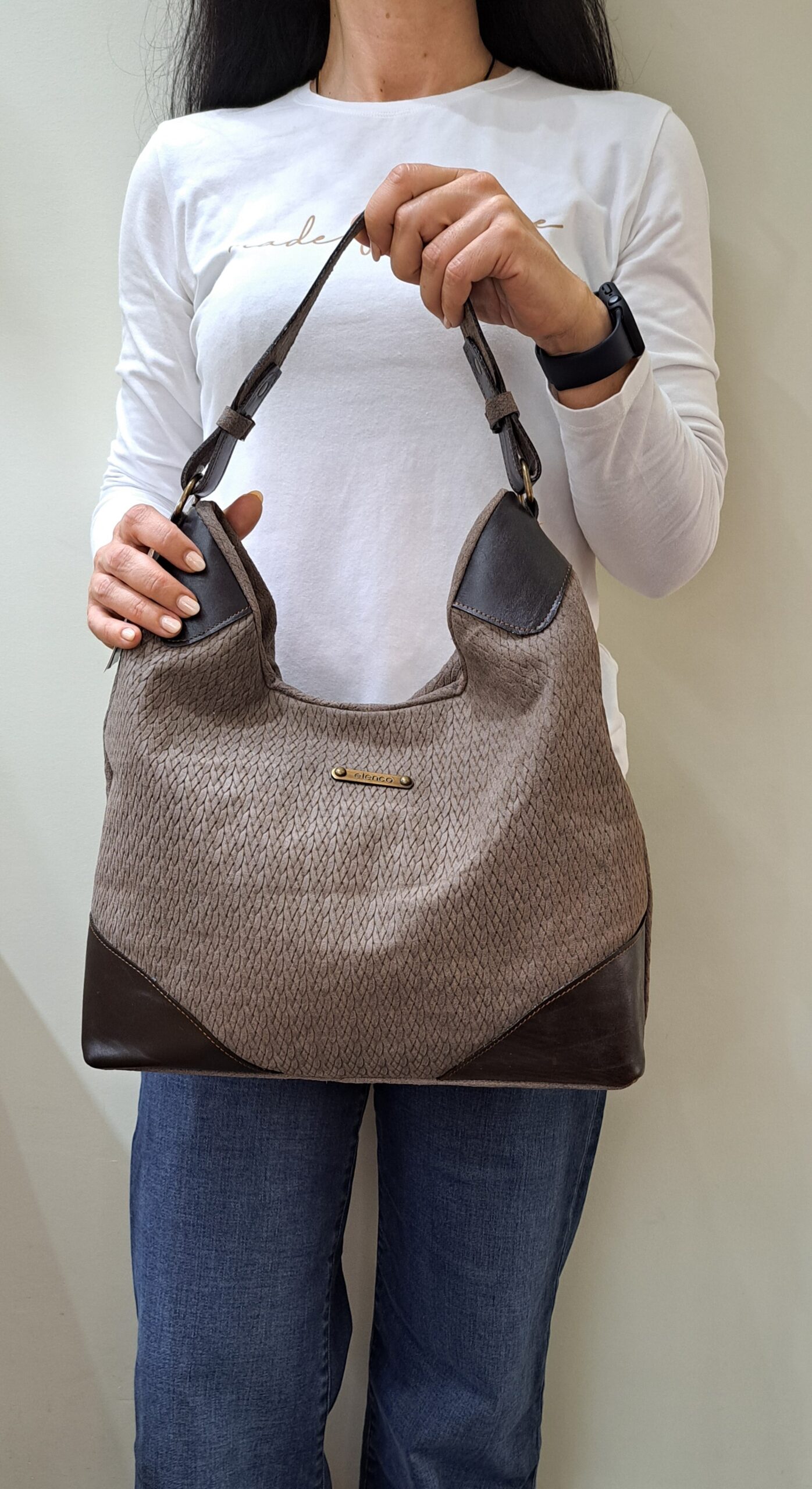 Mala da marca Elenco em pele genuína nas cores cinzento e camel. Abertura principal com fecho de correr. Três bolsos pequenos no interior. Bolso exterior com fecho de correr. Asa de mão e ombro em pele e alça de tiracolo removível e ajustável em pele. Aplicações em metal bronze. Forro em tecido. Inclui um saco de tecido para proteger a sua bolsa enquanto não a usa.
