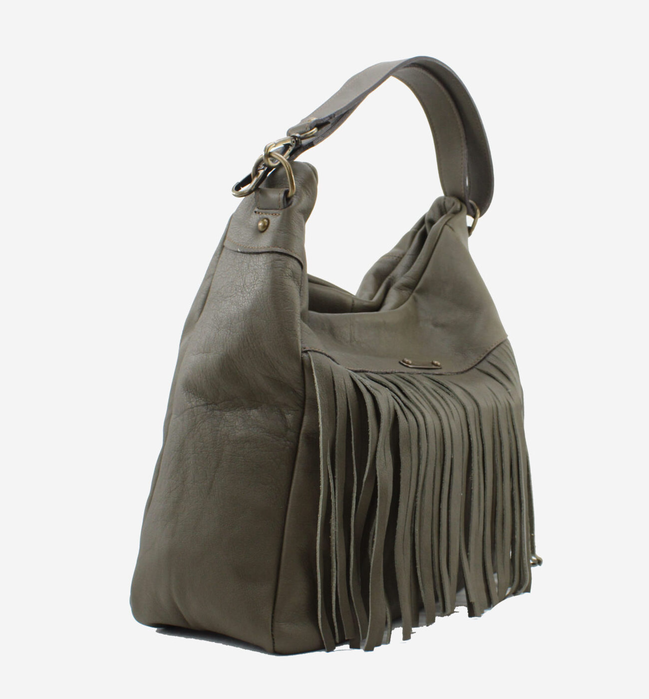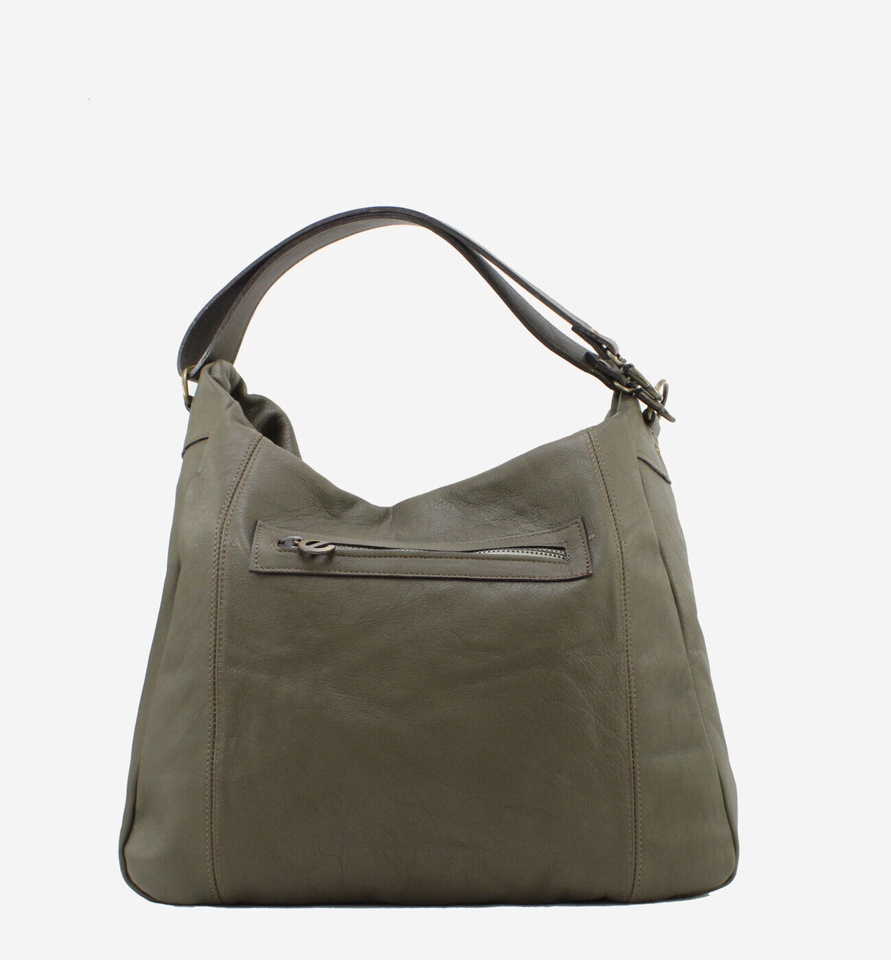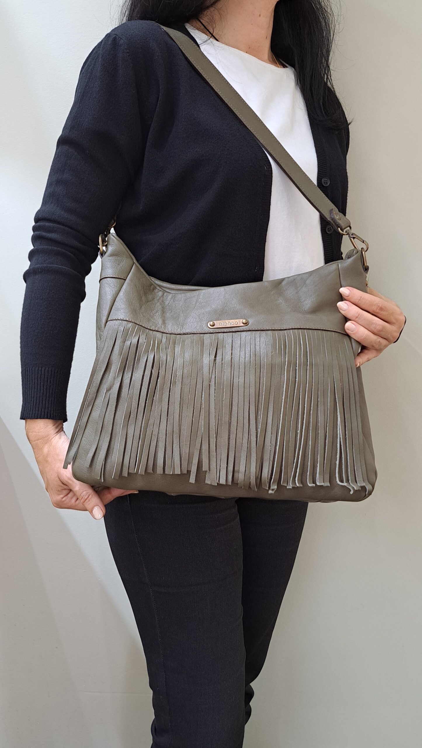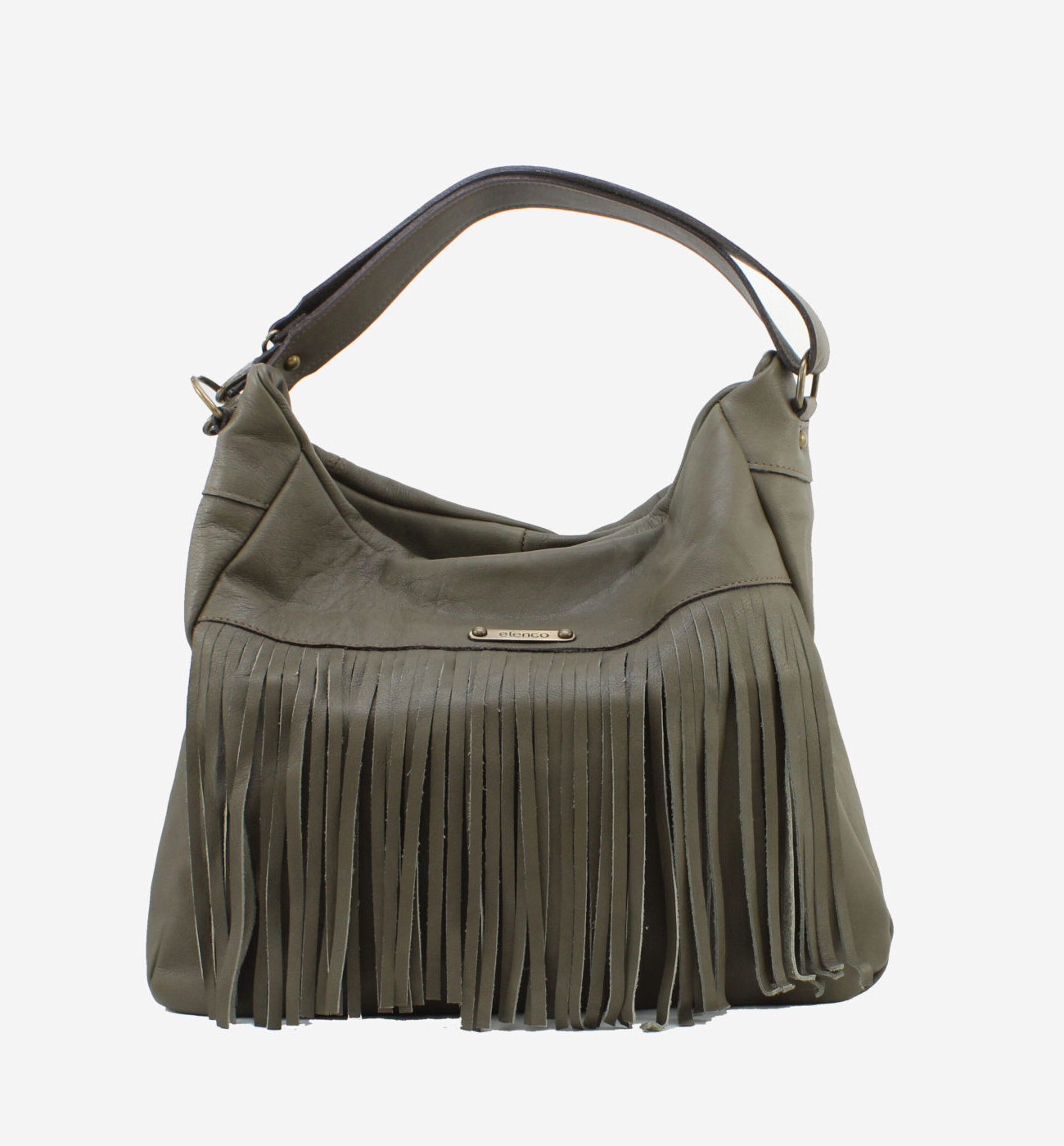 Mala da marca Elenco em pele genuína na cor verde. Abertura principal com fecho de correr. Três bolsos pequenos no interior. Bolso exterior com fecho de correr. Asa de mão e ombro em pele. Aplicações em metal bronze. Forro em tecido. Inclui um saco de tecido para proteger a sua bolsa enquanto não a usa.