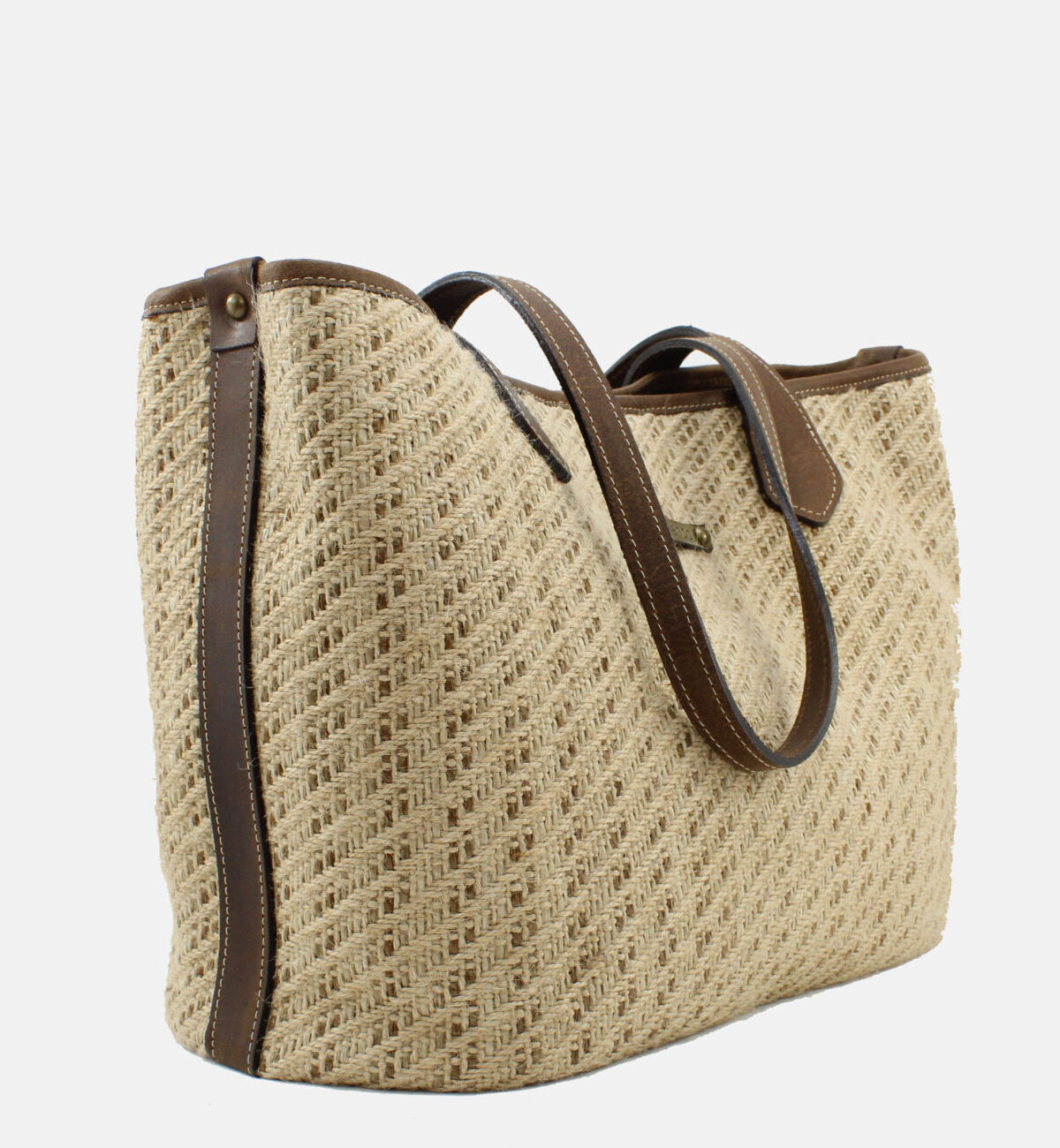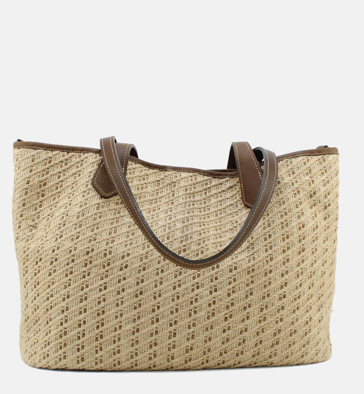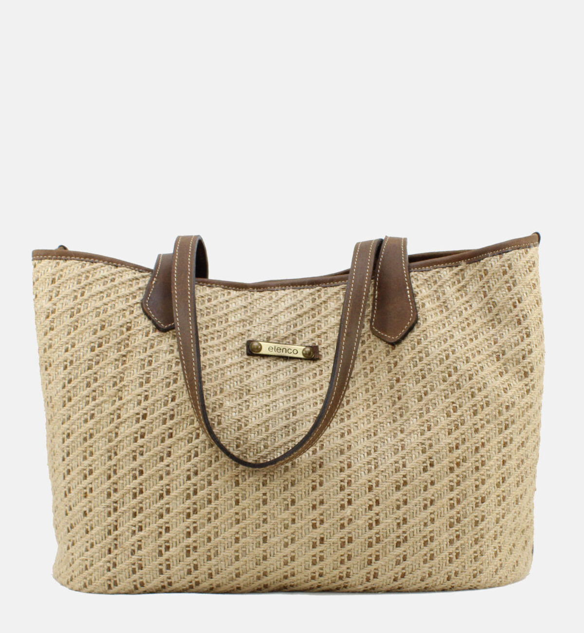 Mala da marca Elenco em tecido de ráfia com pele na cor bege.