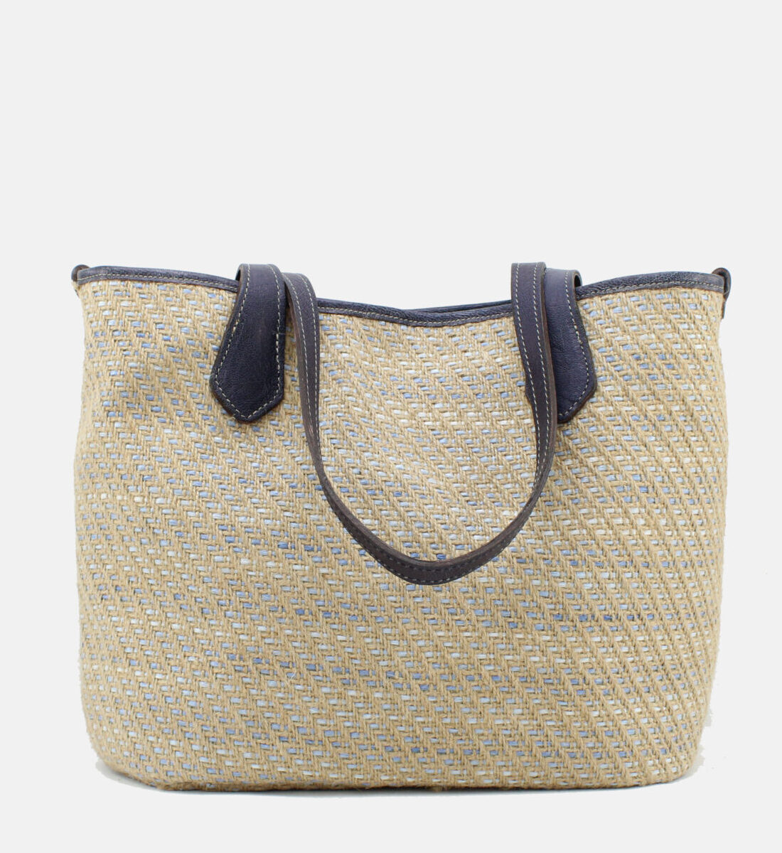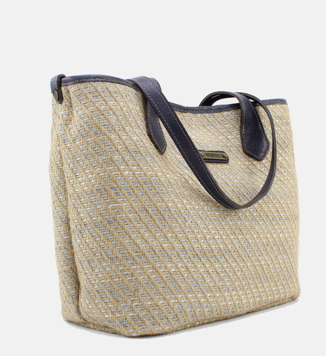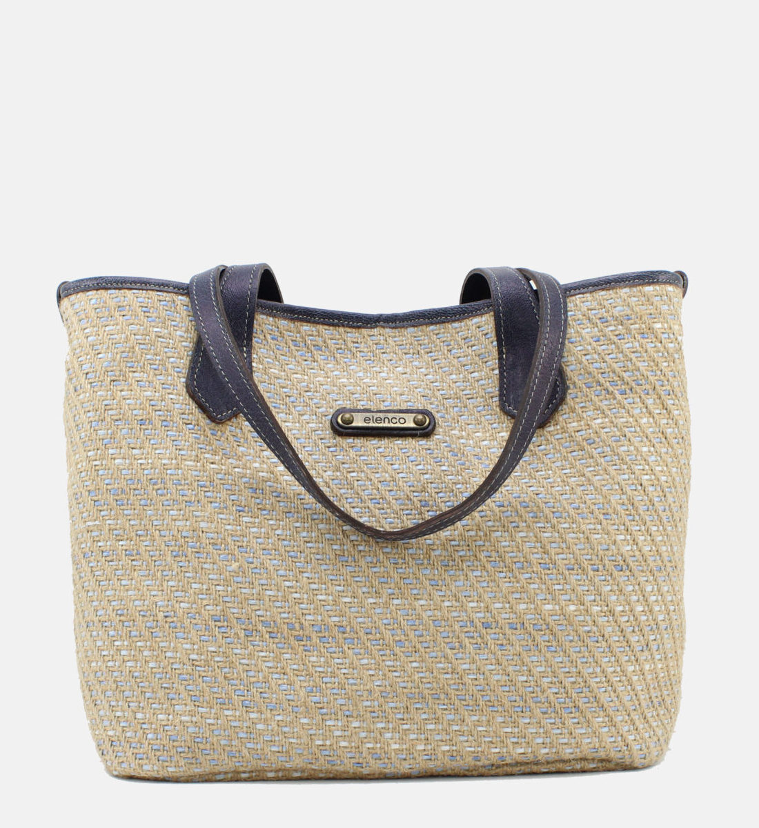 Mala da marca Elenco em tecido de ráfia com pele na cor azul.