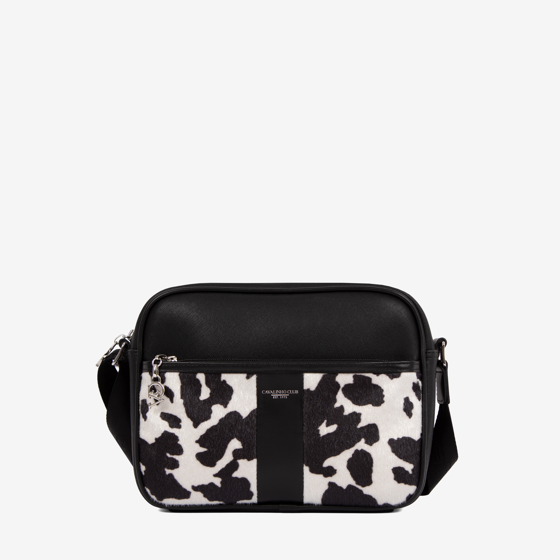 Mala da marca Cavalinho em tela preta com detalhes em pele genuína preta e cow print.