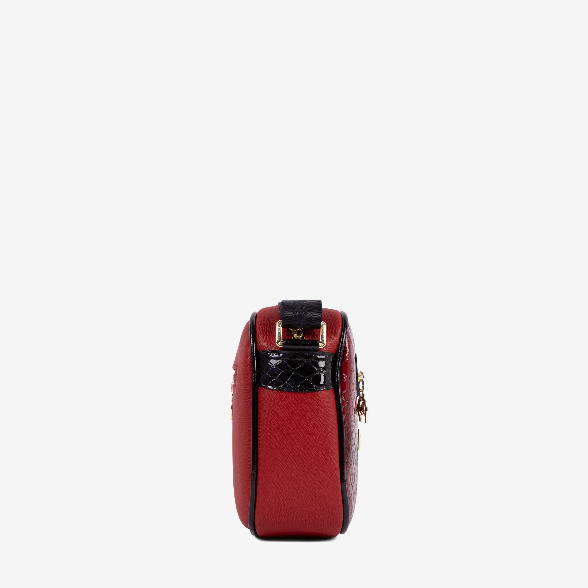 Mala da marca Cavalinho em tela vermelha com detalhes em pele genuína vermelha, azul e bege.