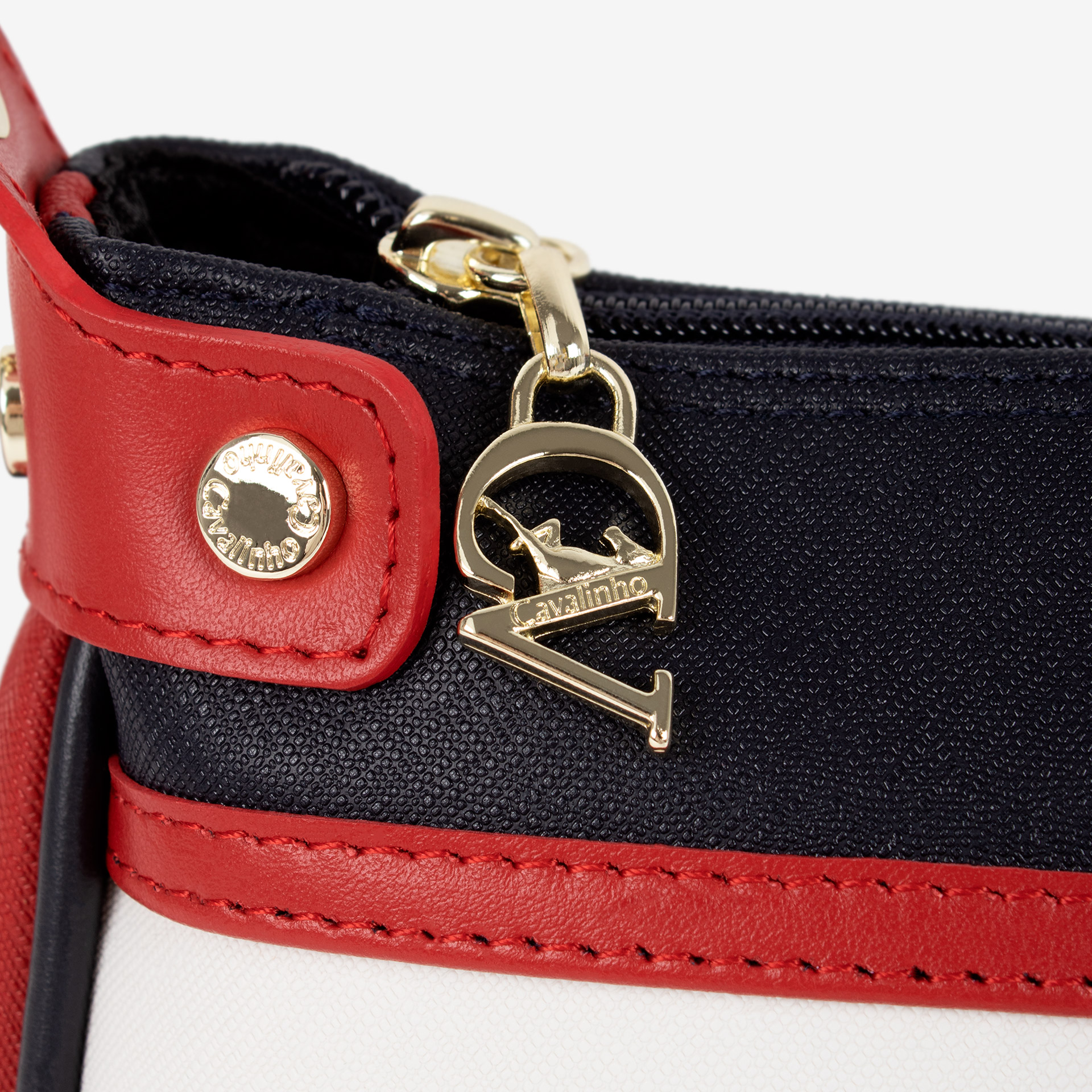 Mala da marca Cavalinho em tela azul, vermelha e branca com detalhes em pele genuína azul e vermelha.