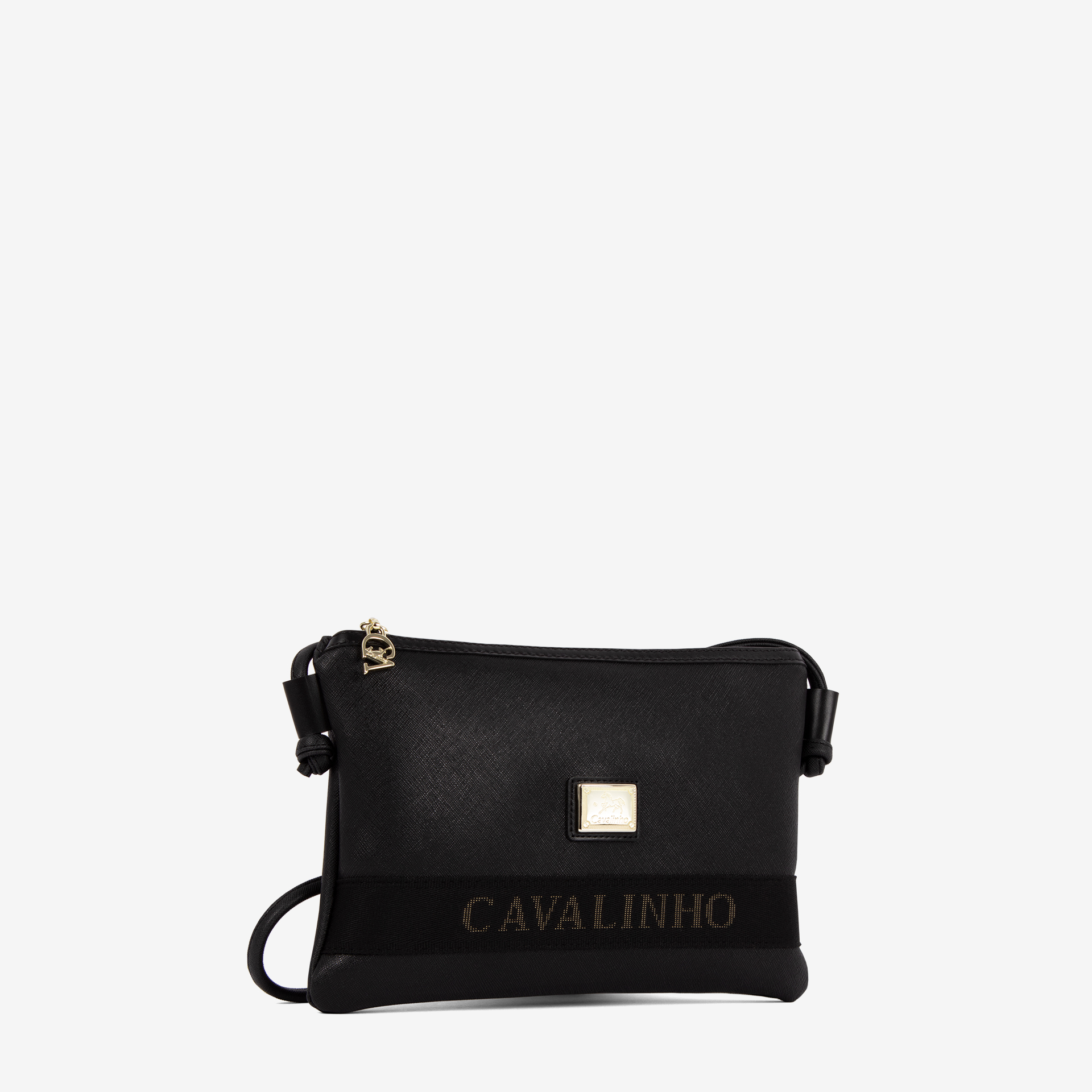 Mala da marca Cavalinho em tela preta com detalhes em pele genuína preta. Abertura principal com fecho de correr. Dois bolsos pequenos no interior um com fecho de correr. Bolso exterior pequeno com fecho de correr. Alça de ombro e tiracolo em tela. Aplicações em metal dourado antialérgico. Forro em tecido personalizado.