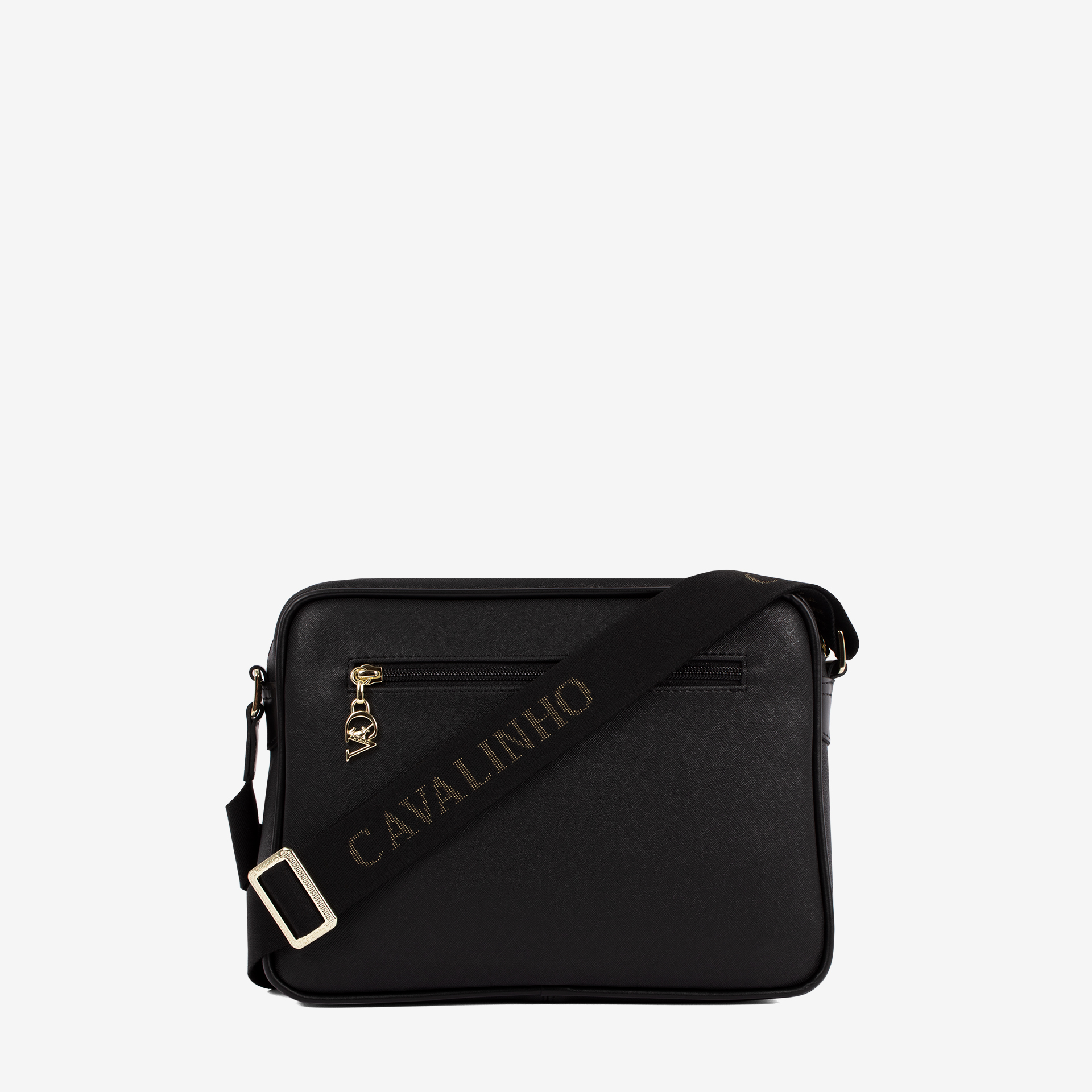 Dois bolsos interiores um com fecho de correr. Fecho de correr exterior. Alça ajustável de ombro e tiracolo em poliéster. Aplicações em metal dourado antialérgico. Forro em tecido personalizado.