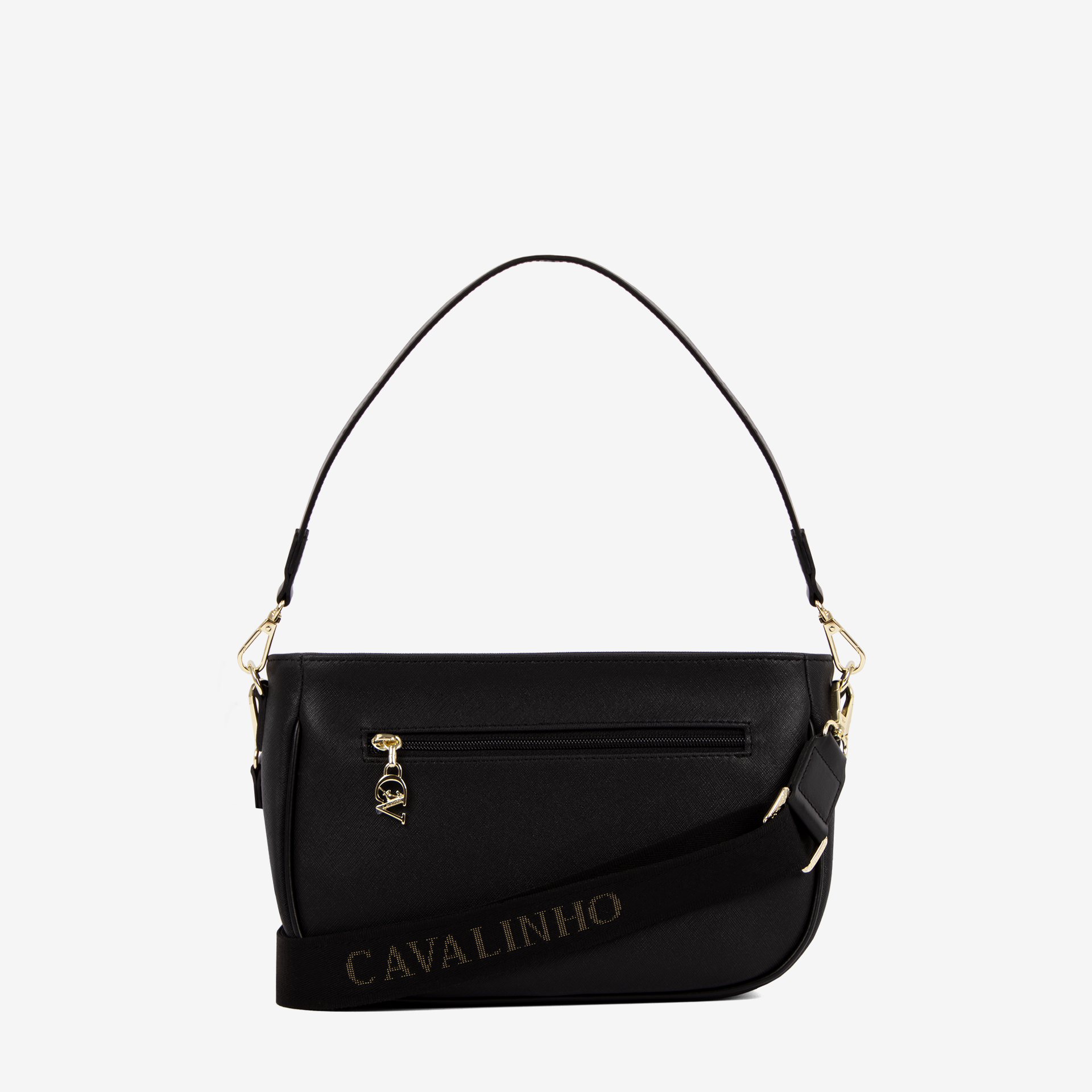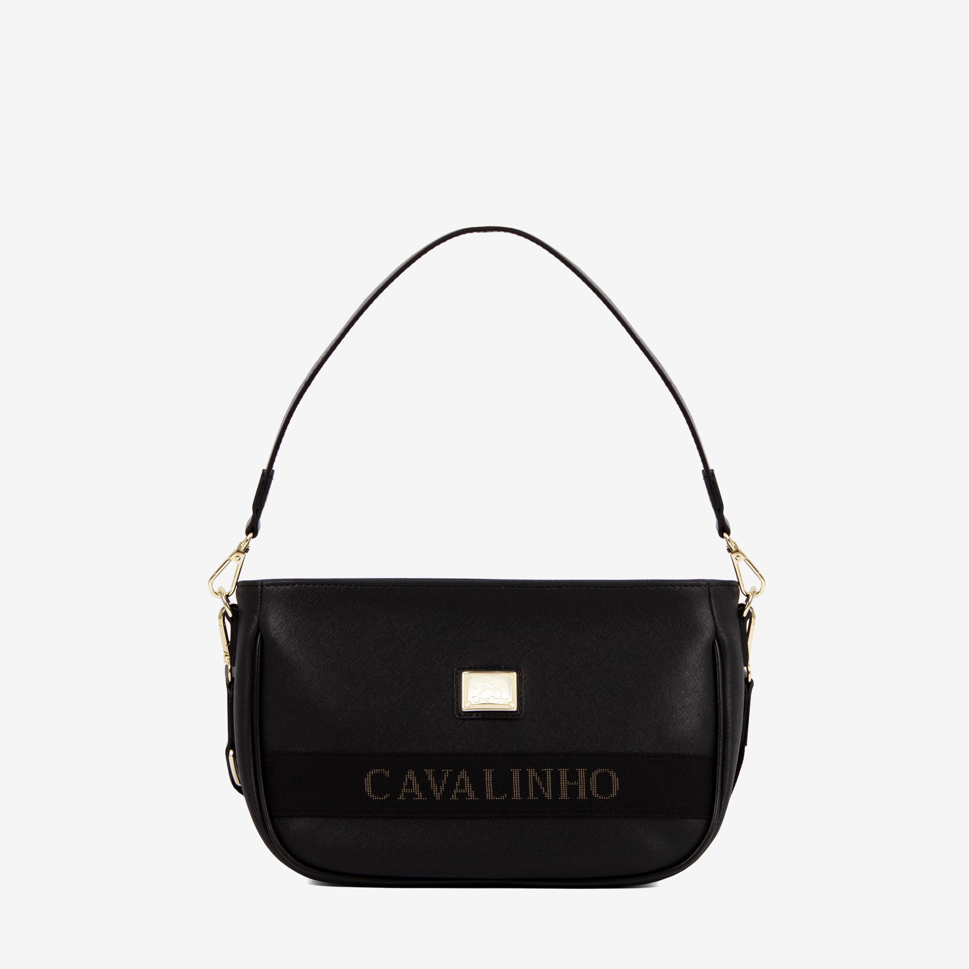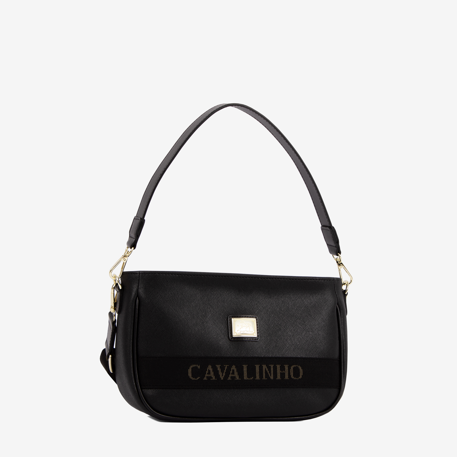 Mala da marca Cavalinho em tela preta com detalhes em pele genuína preta. Abertura principal com fecho de correr. Dois pequenos bolsos interiores um com fecho de correr. Bolso exterior com fecho de correr. Asa de mão removível em pele. Alça ajustável e removível de ombro e tiracolo em poliéster. Aplicações em metal dourado antialérgico. Forro em tecido personalizado.