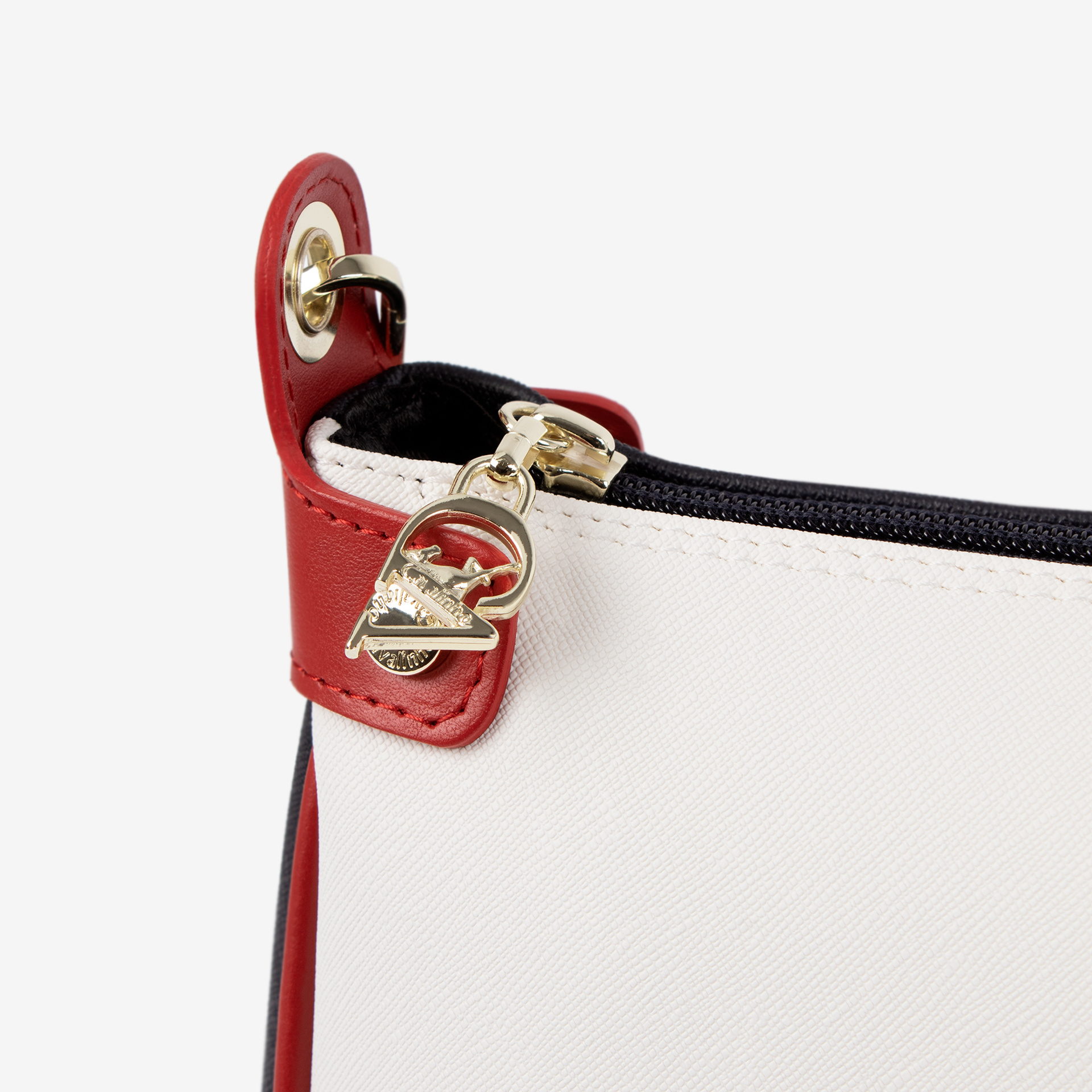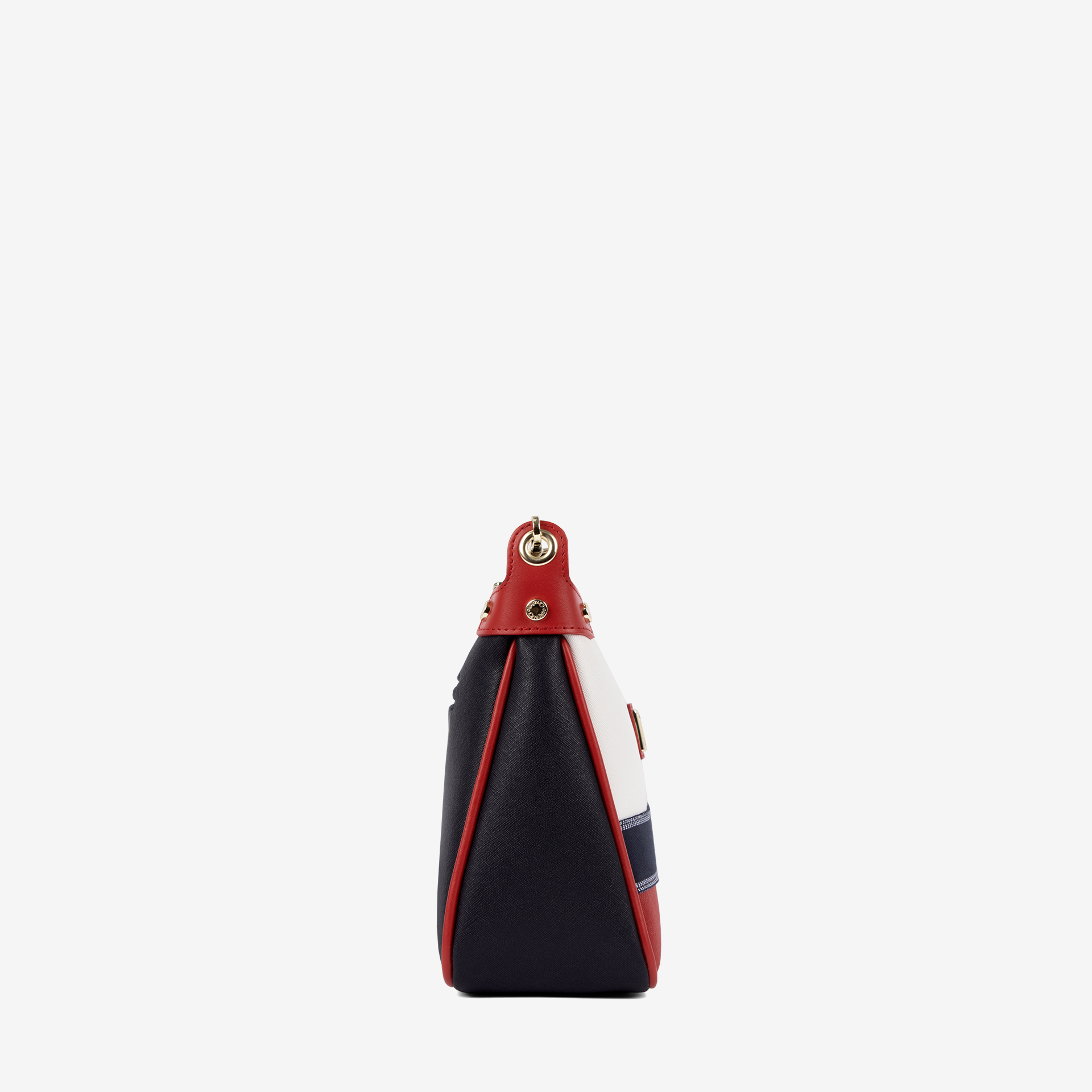 Mala da marca Cavalinho em tela azul, vermelha e branca com detalhes em pele genuína.