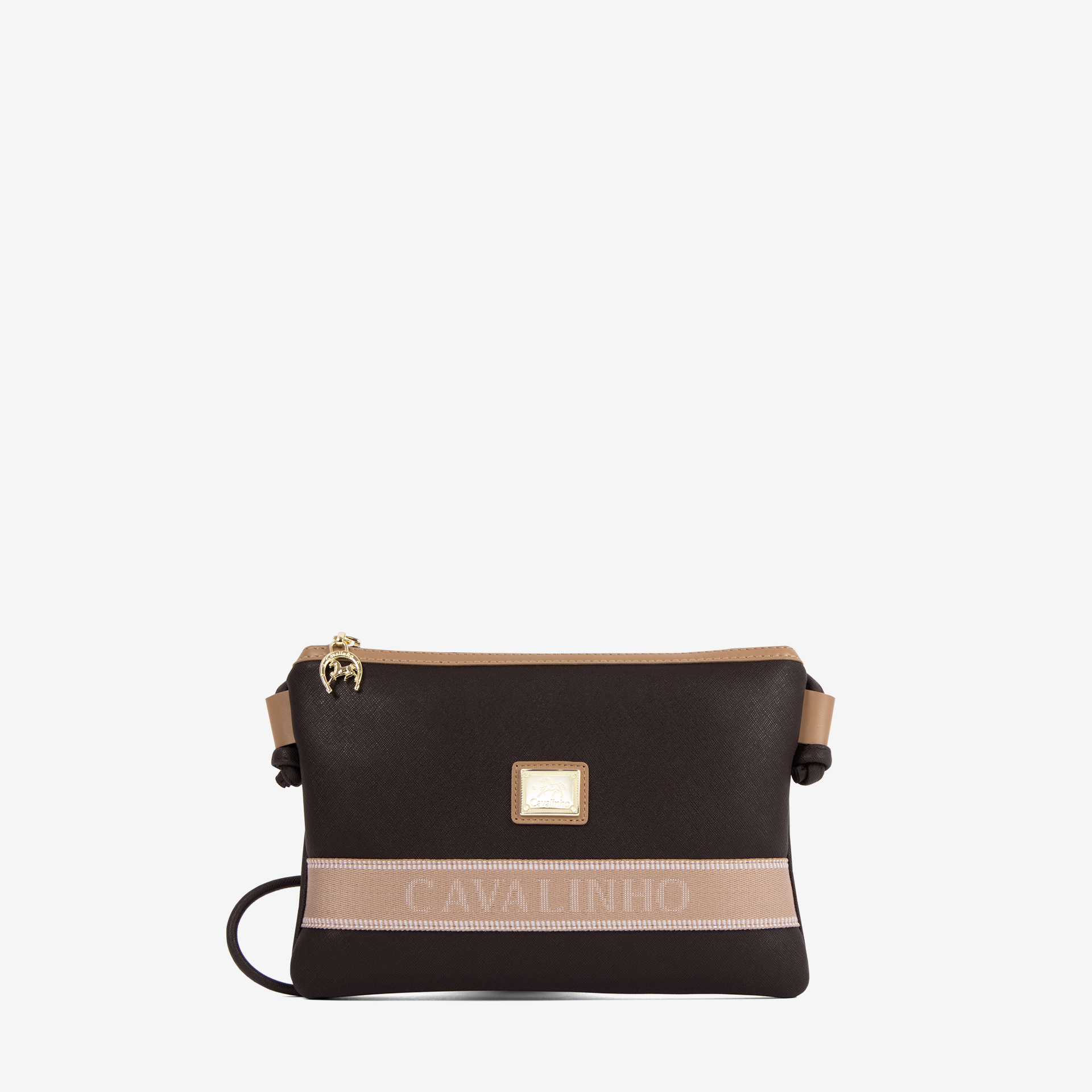 Mala da marca Cavalinho em tela castanha com detalhes em pele genuína bege. Abertura principal com fecho de correr. Dois bolsos pequenos no interior um com fecho de correr. Bolso exterior pequeno com fecho de correr. Alça de ombro e tiracolo em tela. Aplicações em metal dourado antialérgico. Forro em tecido personalizado.