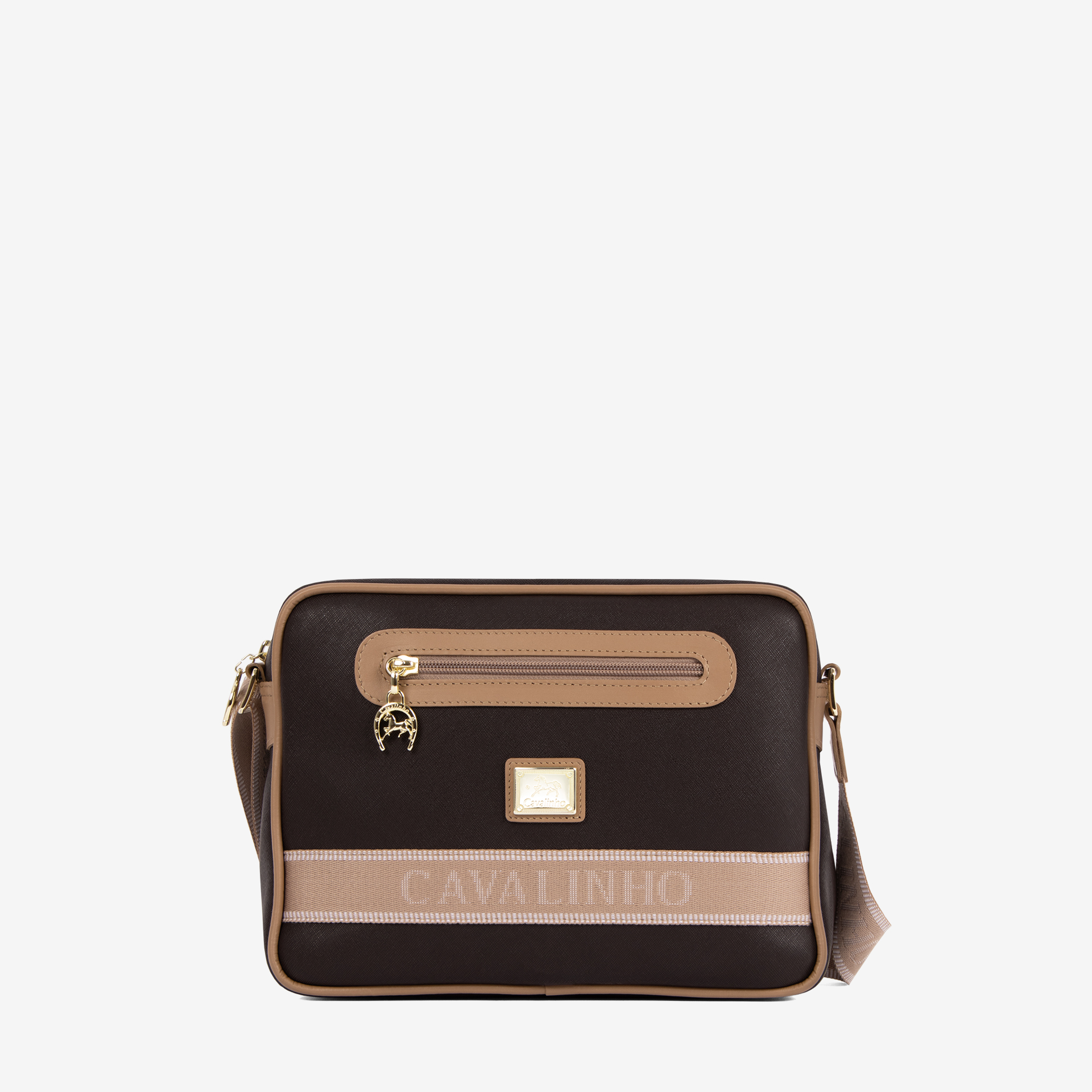 Mala da marca Cavalinho em tela castanha com detalhes em pele genuína bege. Abertura principal com fecho de correr.