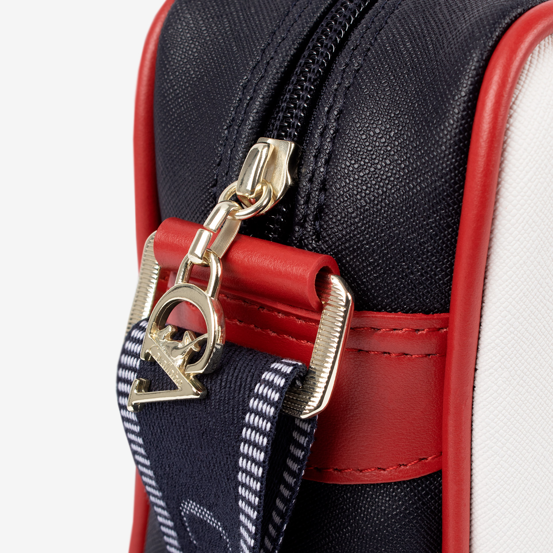 Mala da marca Cavalinho em tela azul, vermelha e branca com detalhes em pele genuína.