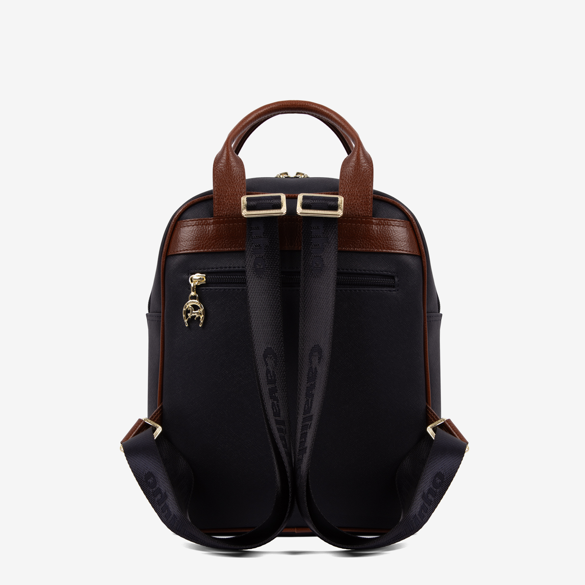 Alças em poliéster ajustáveis e duas asas de mão em pele.