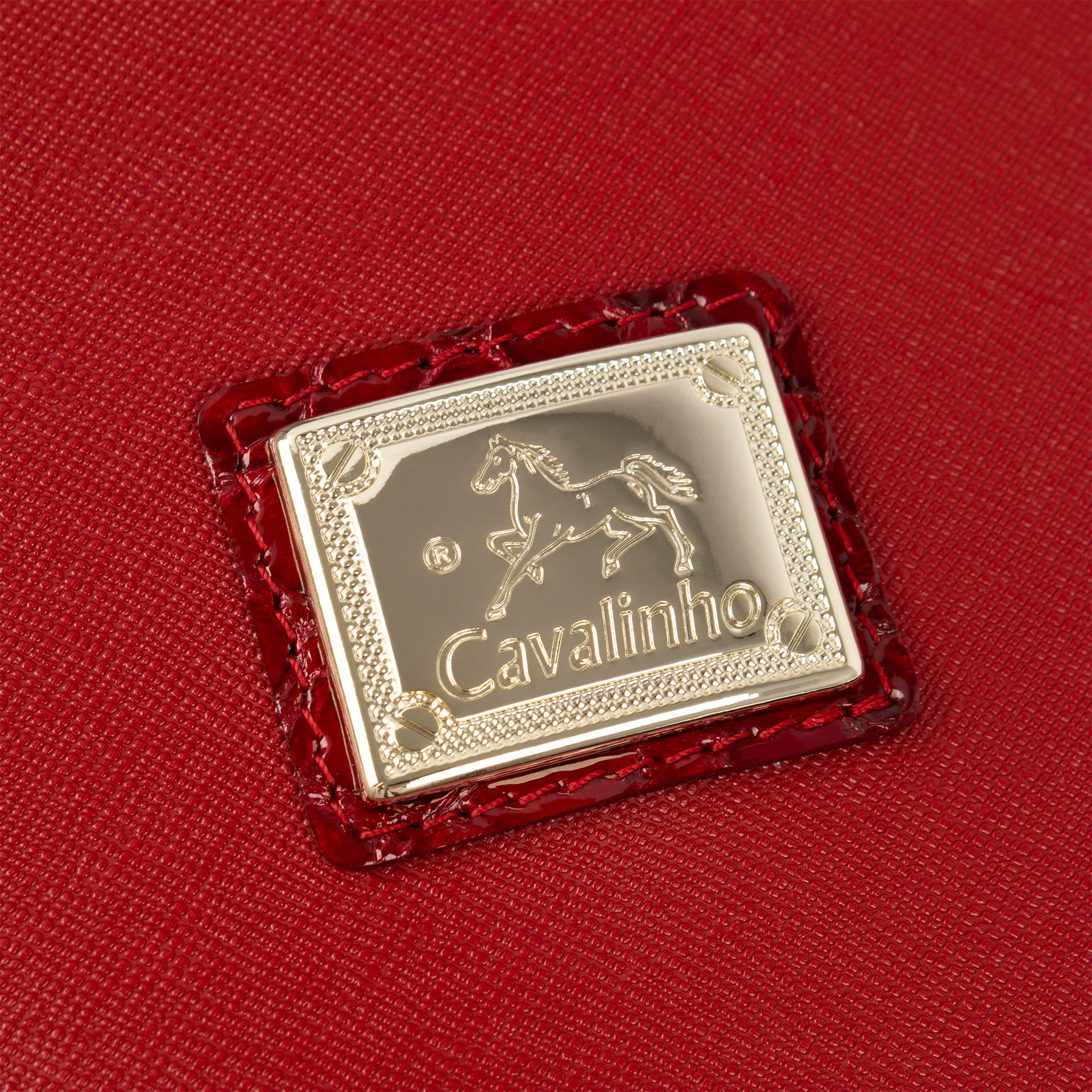 Mochila da marca Cavalinho em tela vermelha com detalhes em pele genuína vermelha, azul, e bege.