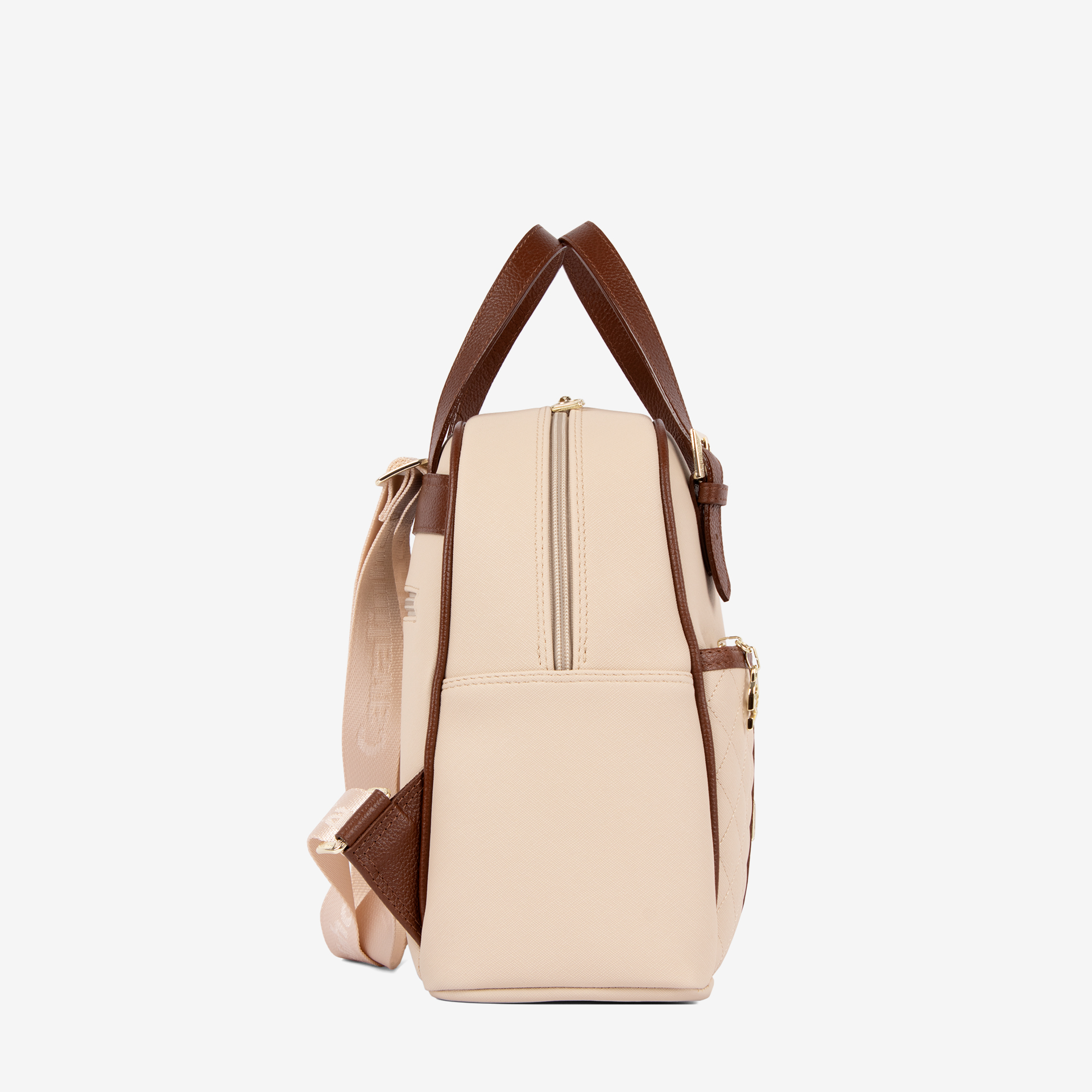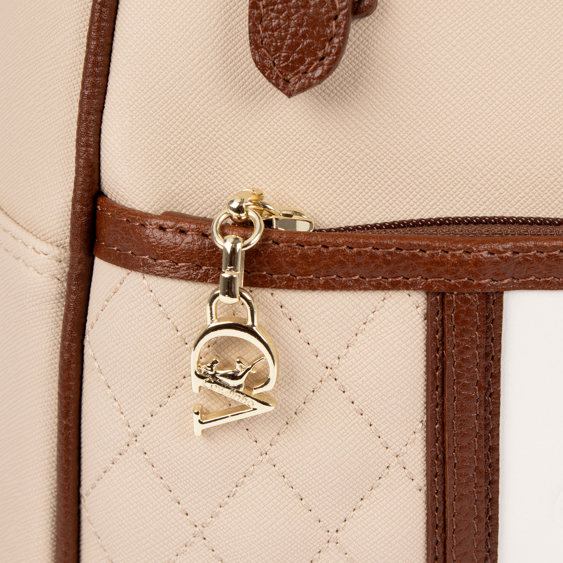 Mochila da marca Cavalinho em tela bege e camel com detalhes em pele genuína branca e camel.