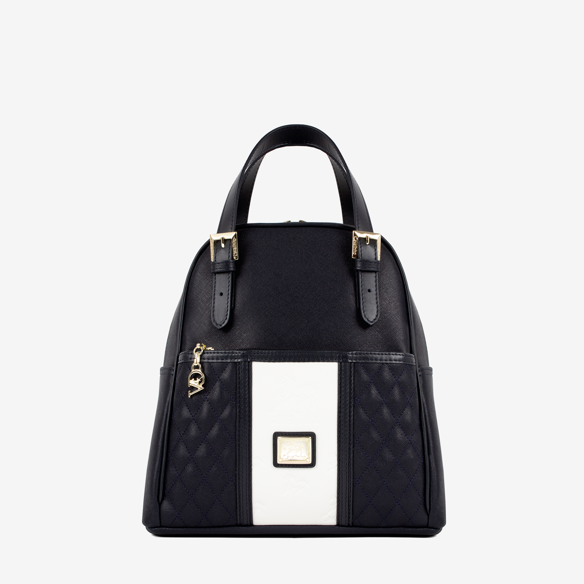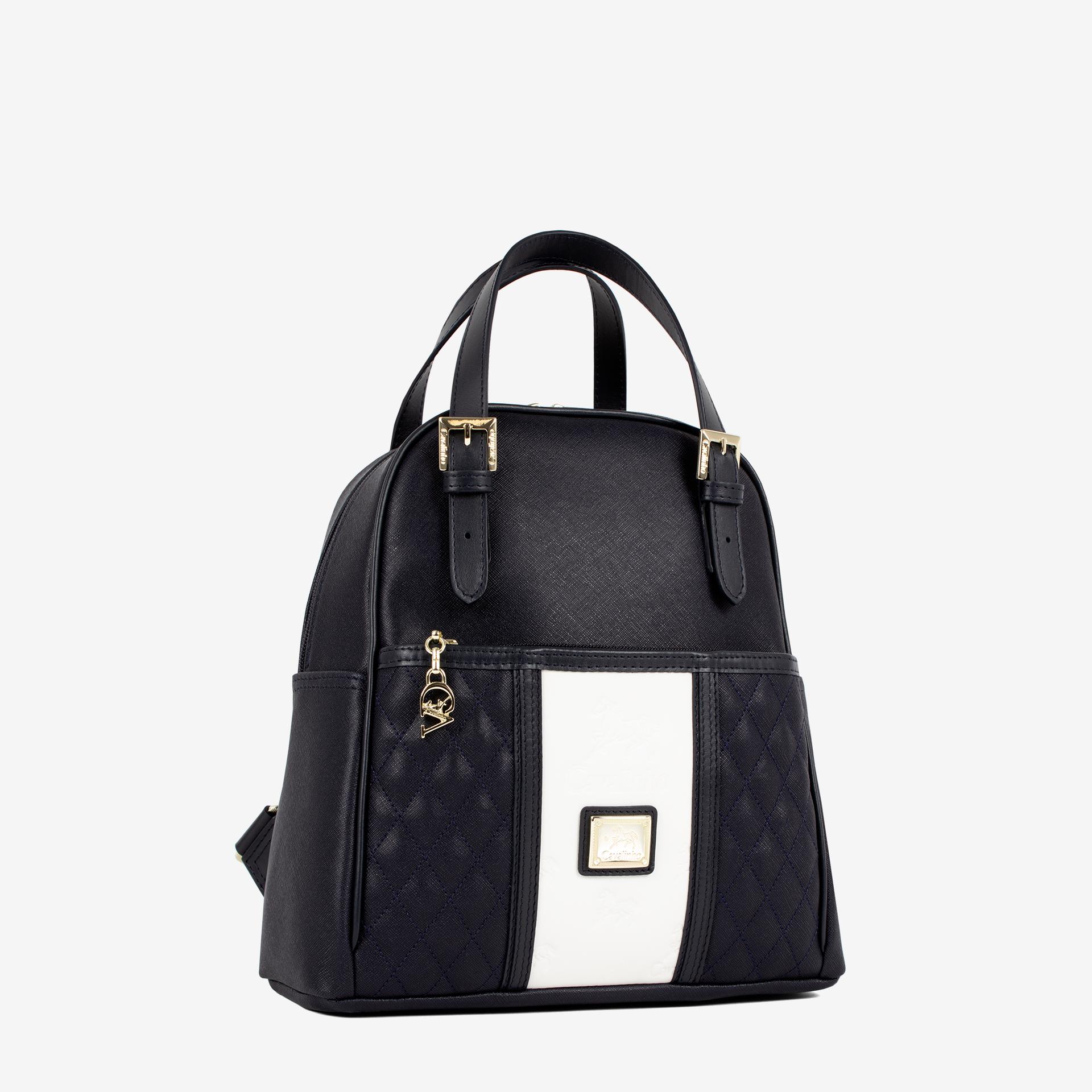 Mochila da marca Cavalinho em tela azul com detalhes em pele genuína branca.