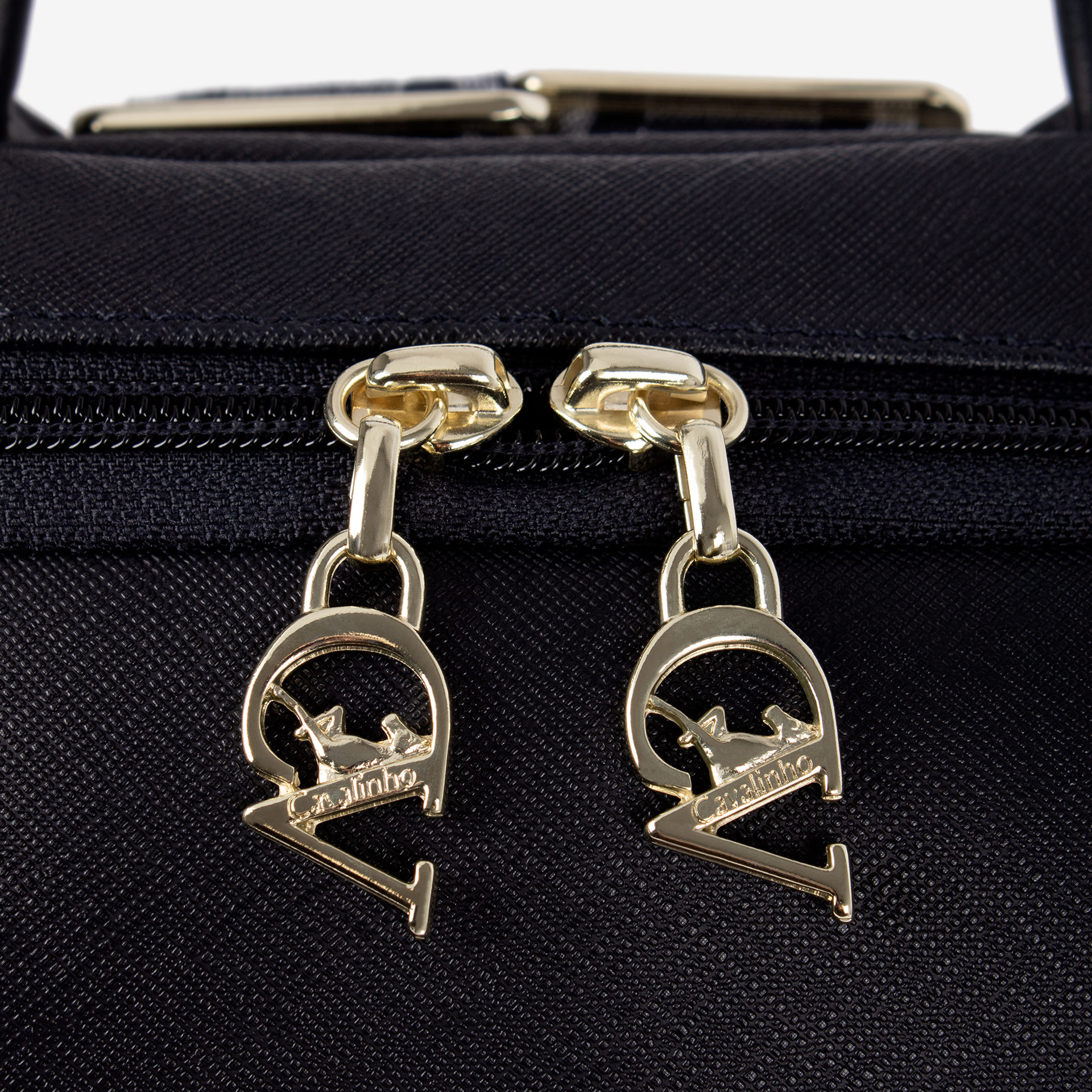 Duas alças ajustáveis em poliéster e uma asa de mão em pele.